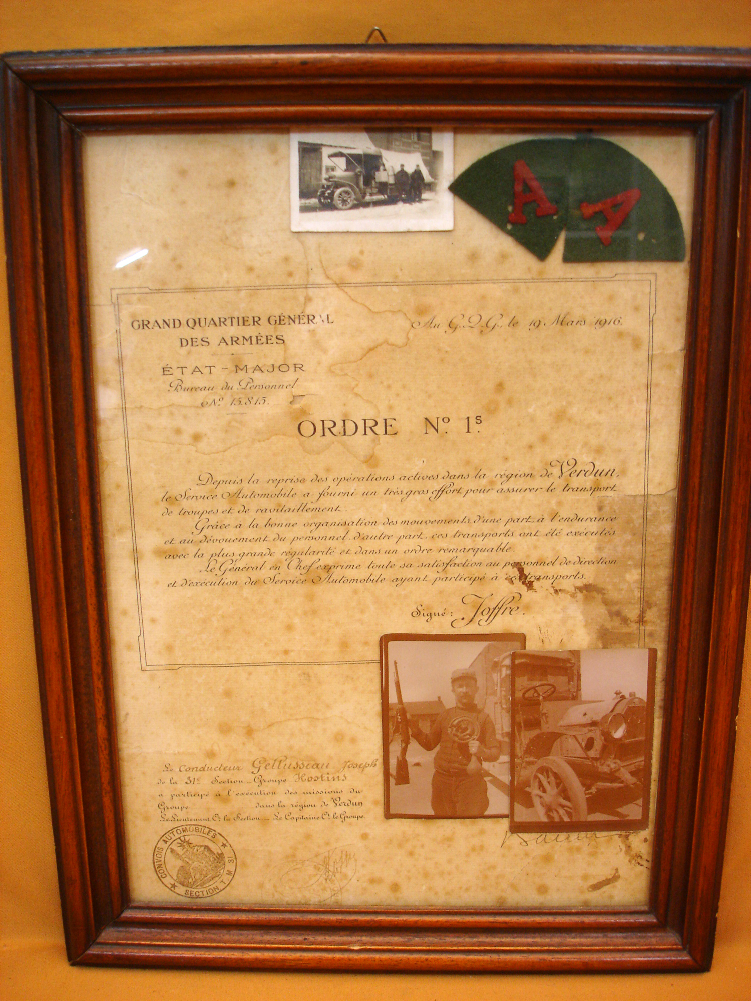 Cadre souvenir d'un soldat conducteur sur la "Voie sacrée", attestation du conducteur Joseph Gellusseau appartenant au groupe Hostins de la 31e section de transport militaire, sur la "voie sacrée" ...