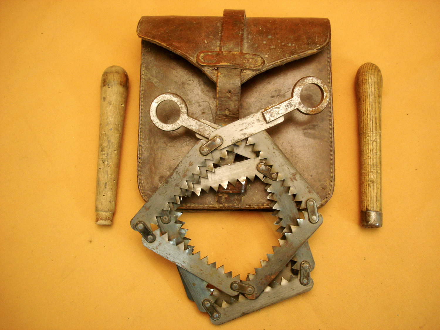 Scie articulée datée 1906, dans son étui en cuir marron, bien marquée, du type cavalerie, scie du fabricant Peugeot, usure d'usage. Prix : 100,00 € port compris pour la France.
