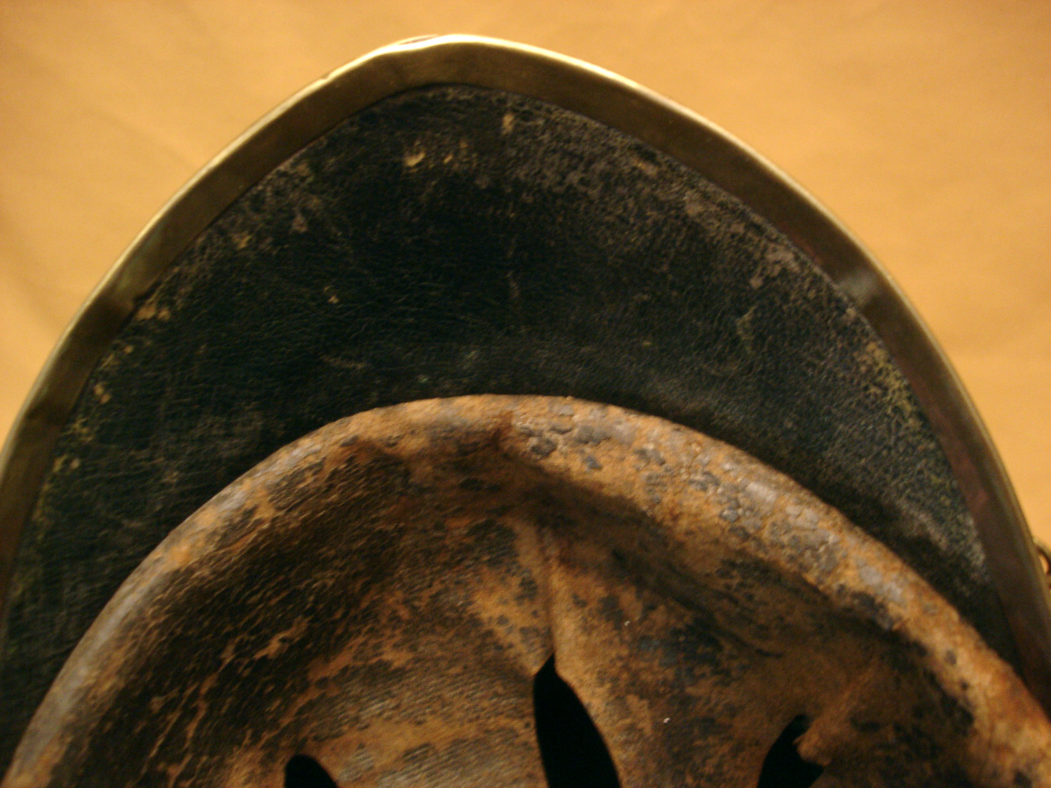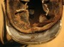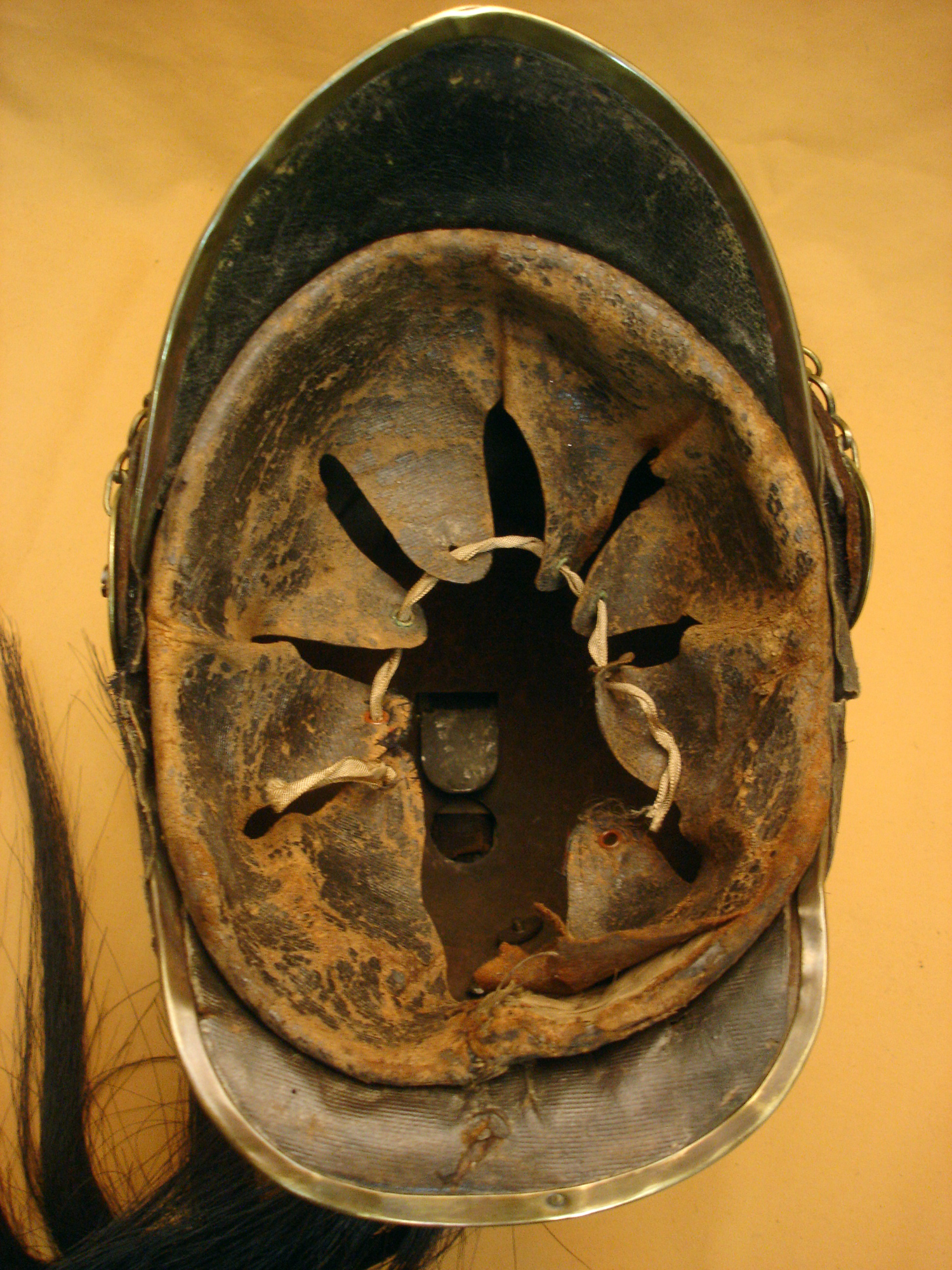 Casque Cuirassier mod.1845, troupe, bombe acier, poinçonnée à l'arrière, turban recouvert d'un bandeau noir en veau marin lacé à l'arrière, avec ses jugulaires à anneaux d'époque et son marmouset. Visière et couvre nuque doublés de basane. Beau casque de Cavalerie du second Empire.
