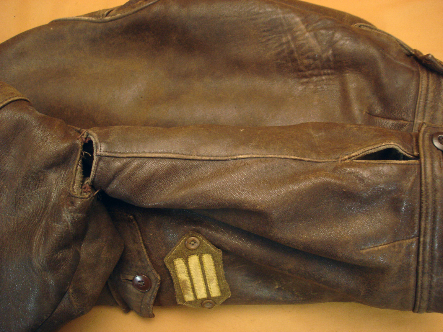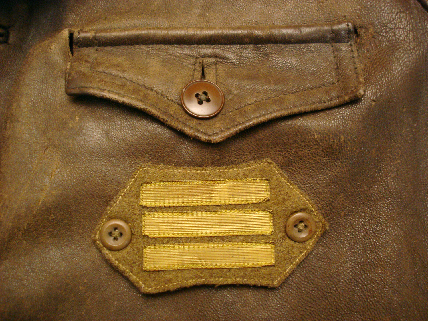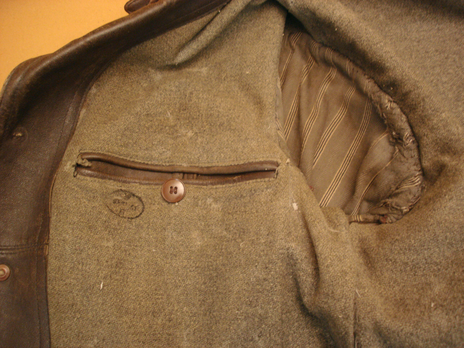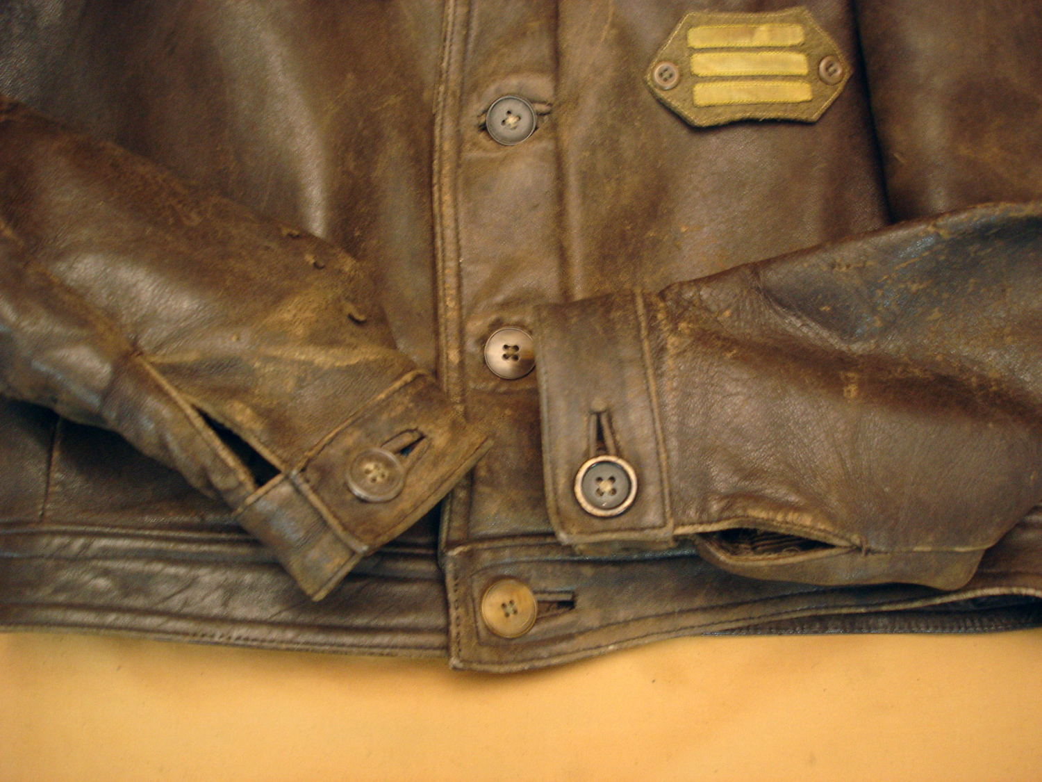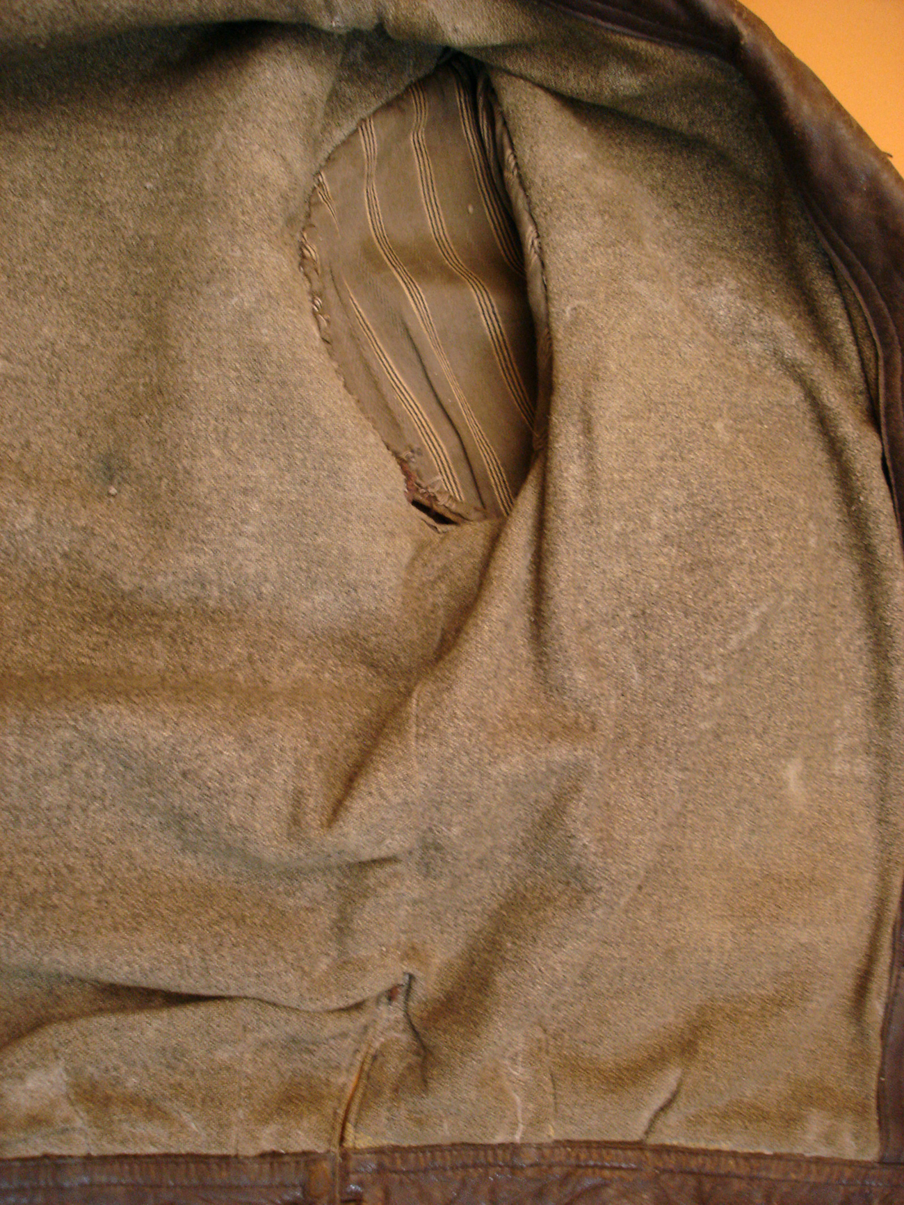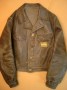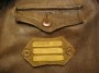 Blouson Chantier de Jeunesse, en cuir marron, doublure réglementaire, tampon de réception de 1941, dans la poche intérieure insigne tissus CJF. Blouson réutilisé par le maquis, grade amovible de capitaine sur la poitrine. Cuir souple, usure d'usage.