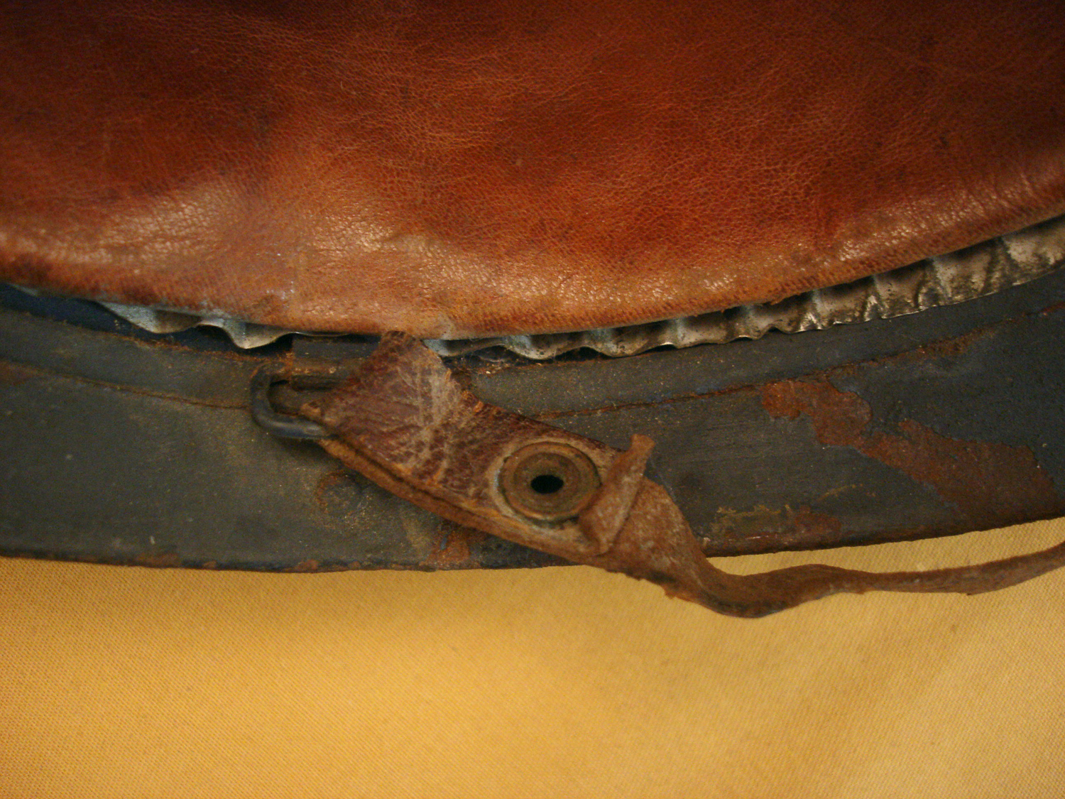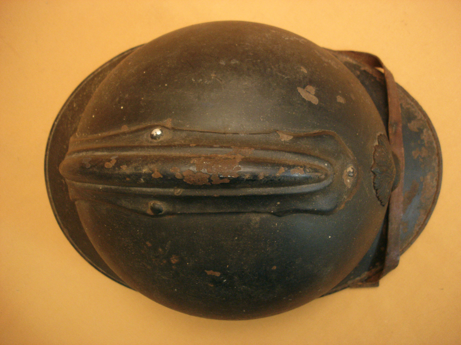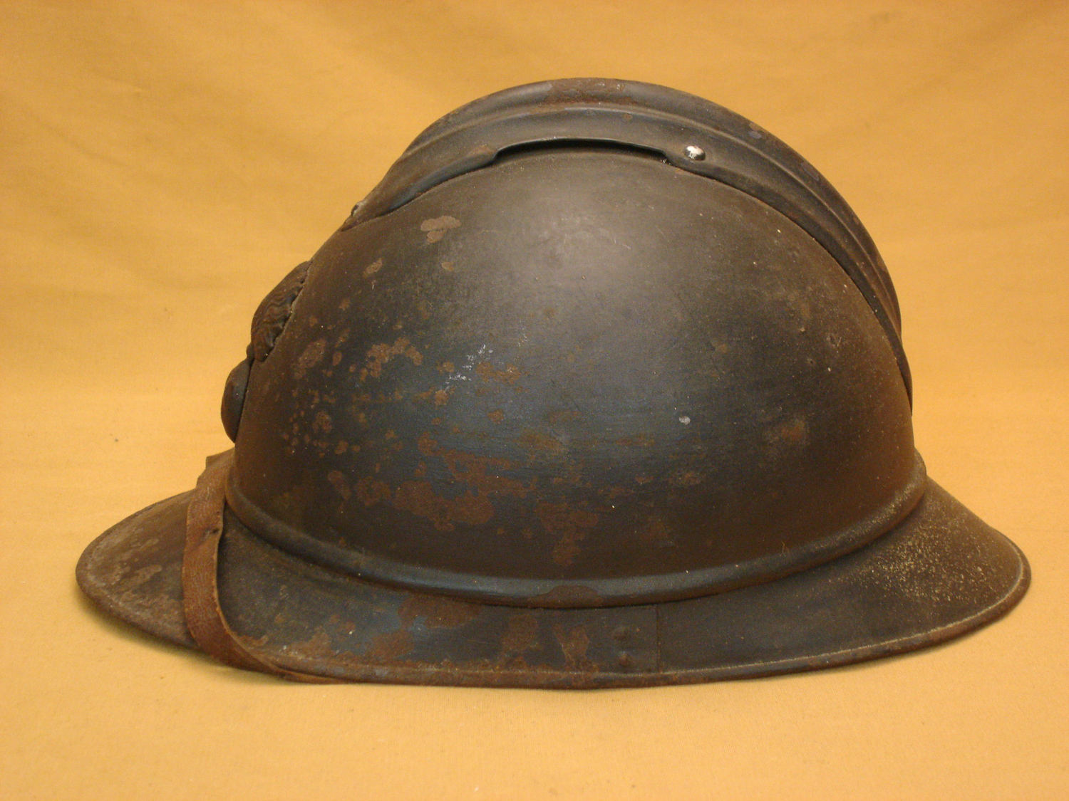 Casque Adrian 15, Infanterie, bleu horizon, fabricant peu courant "Le Jouet de paris", complet avec sa coiffe cuir du 2e type et sa jugulaire, nom du soldat sur le cuir, jamais nettoyé.