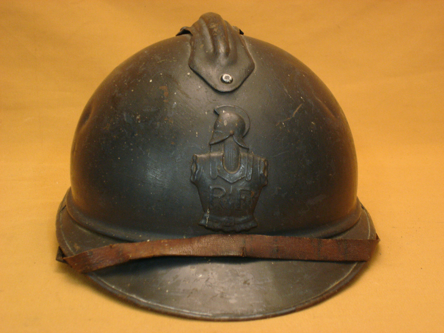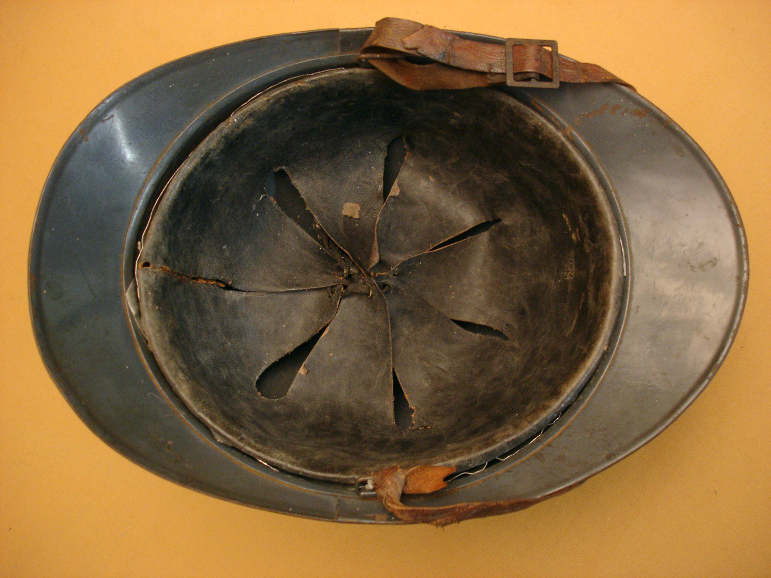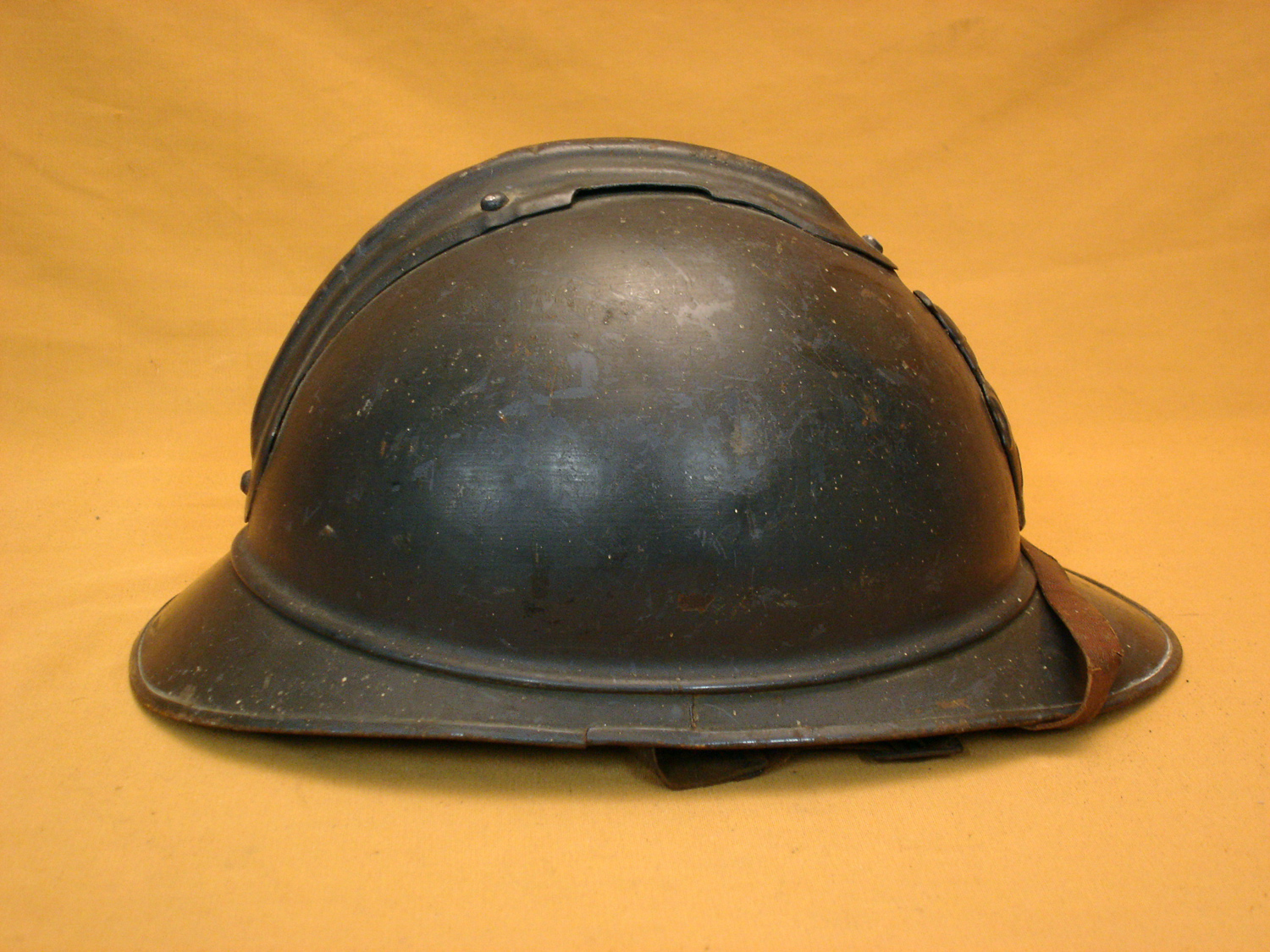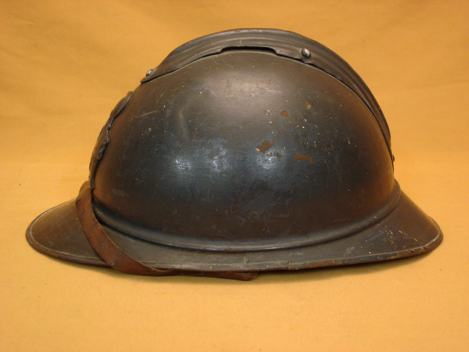 Casque Adrian 15, Génie, bleu horizon, complet avec sa coiffe cuir noir du 1er type et sa jugulaire (une réparation), usure d'usage, en très bon état.