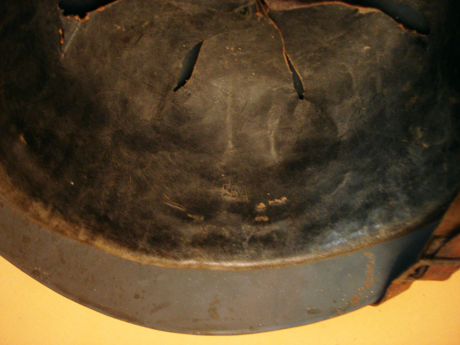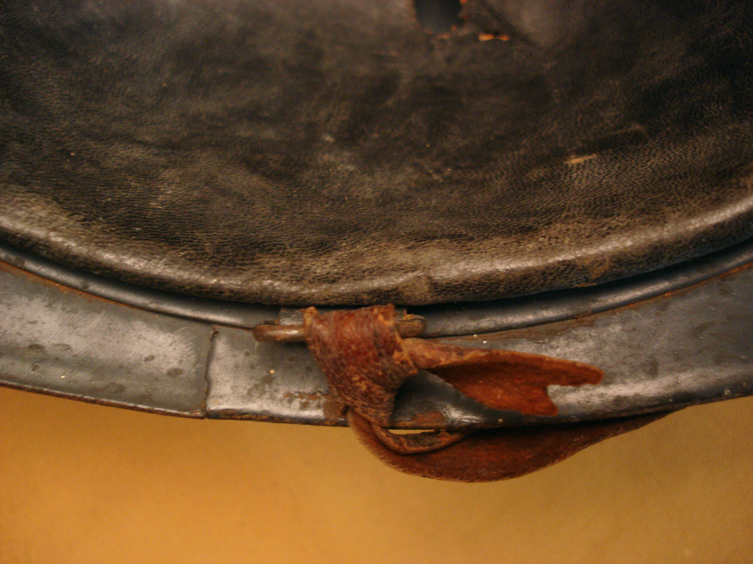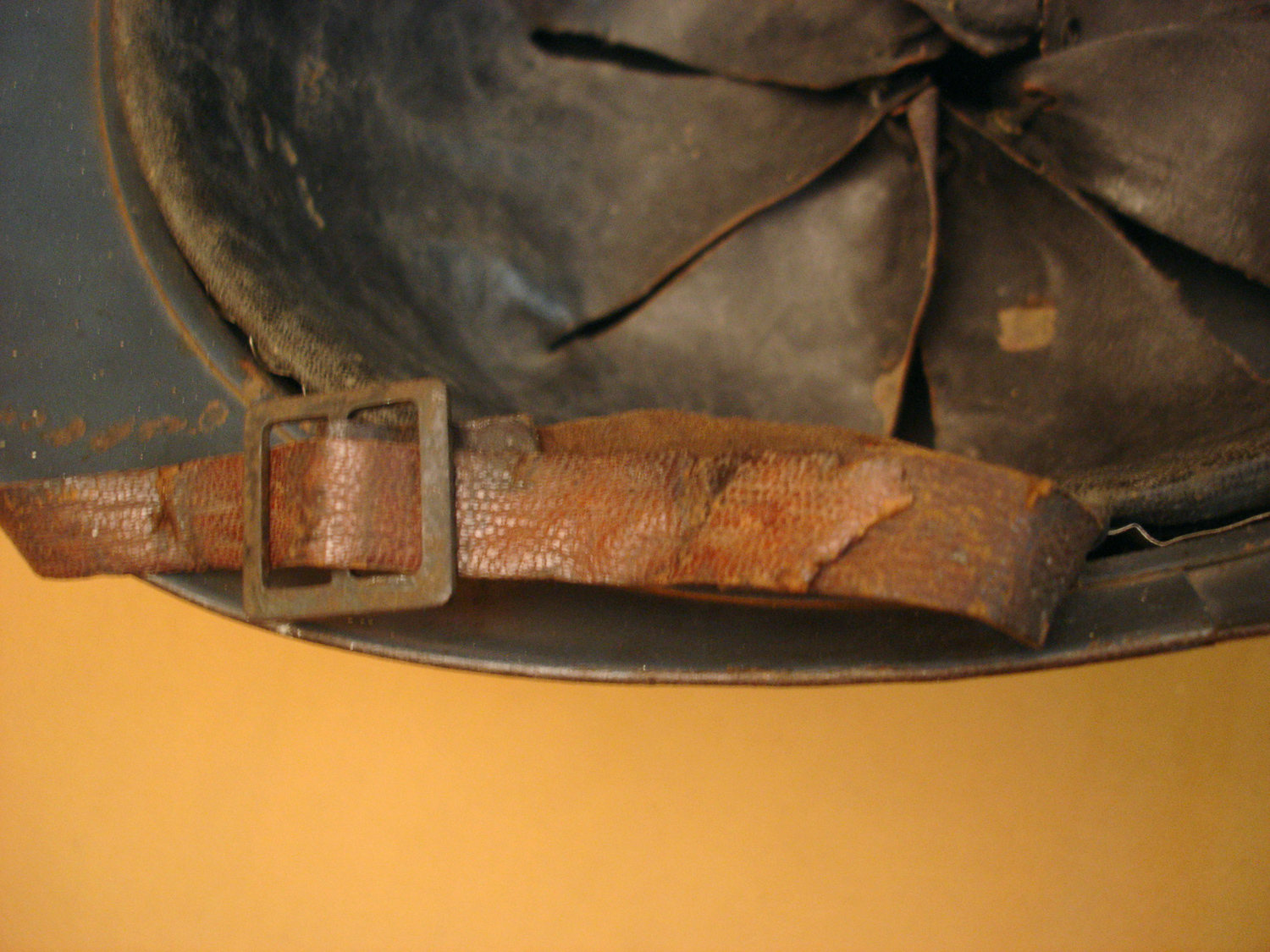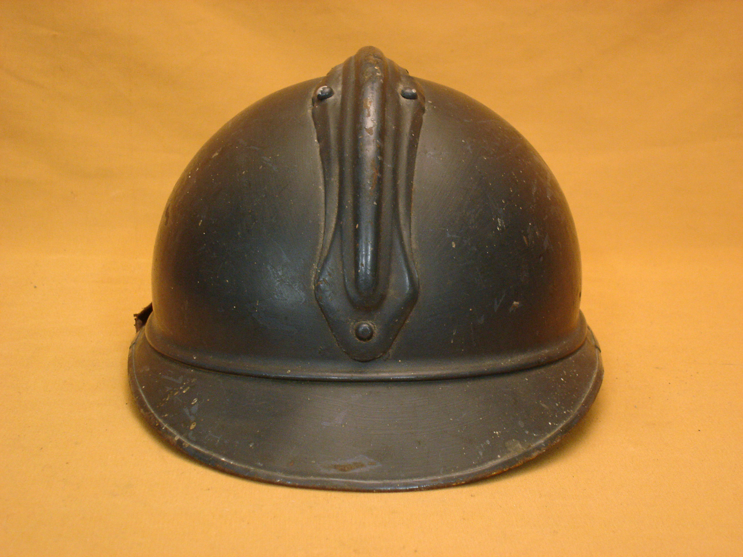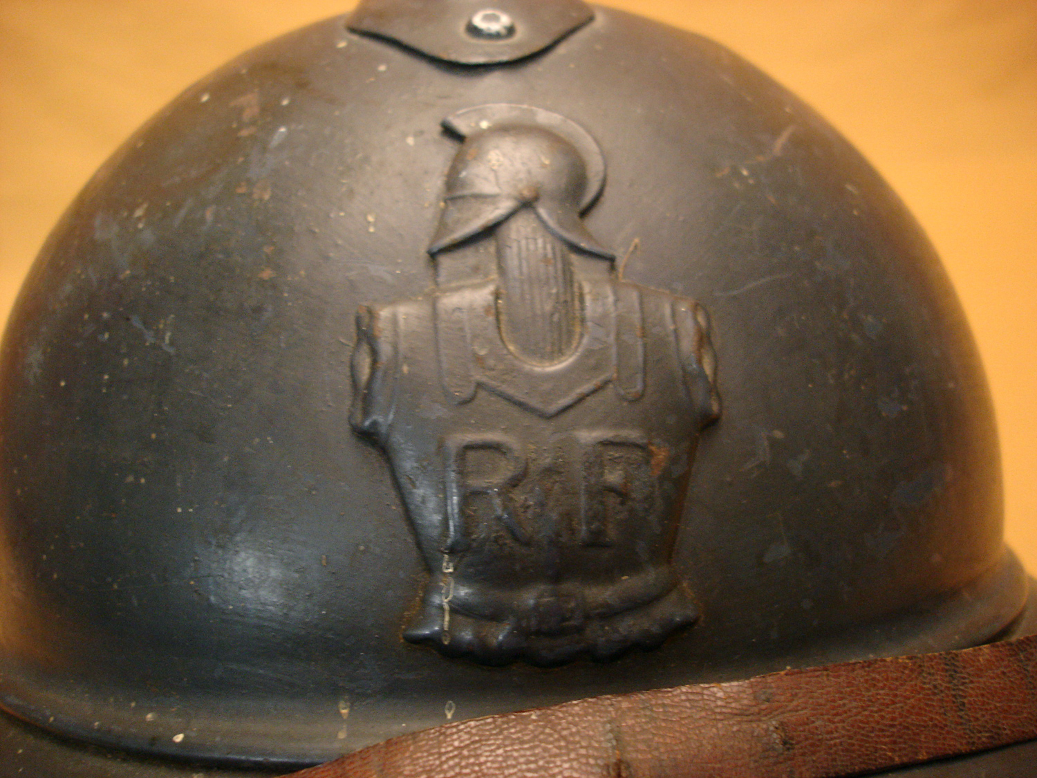 Casque Adrian 15, Génie, bleu horizon, complet avec sa coiffe cuir noir du 1er type et sa jugulaire (une réparation), usure d'usage, en très bon état.