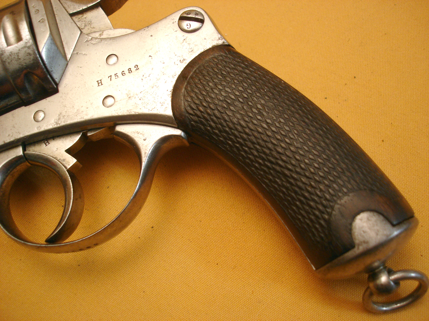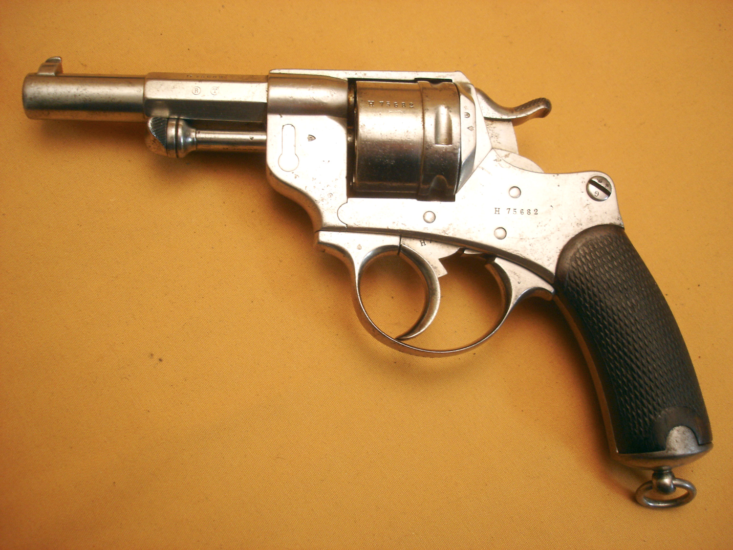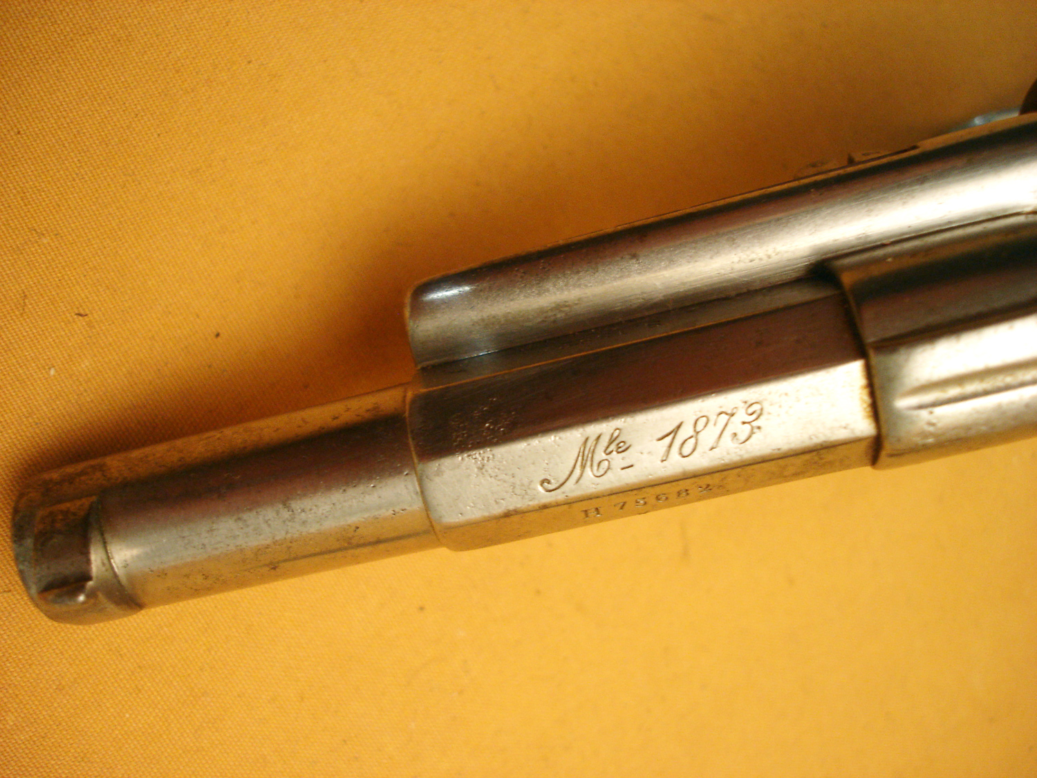 Revolver 1873, manufacture d'armes de St Etienne, daté 1882, bon mécanisme, pièces au même numéro sauf l'axe du barillet. Arme réutilisée en 1914, il a son étui jambon réglementaire, nombreux matricules sur le rabat, usure d'usage.