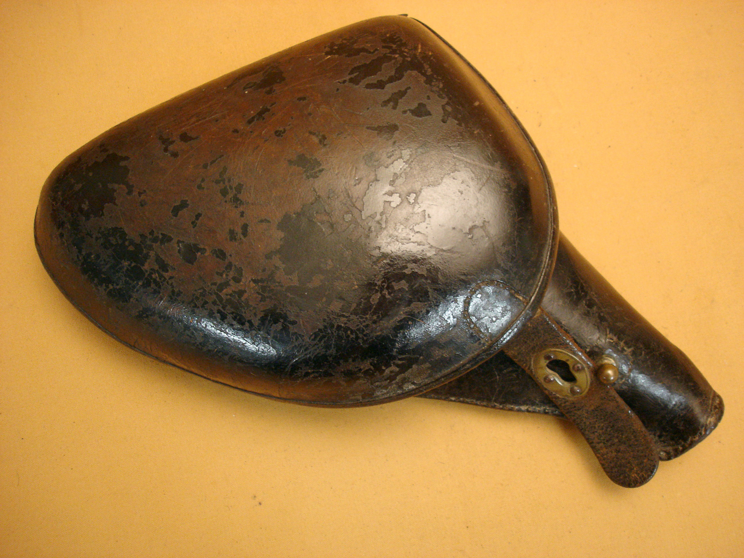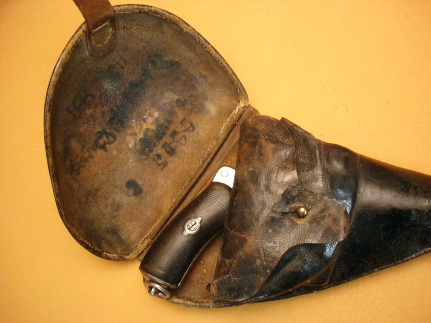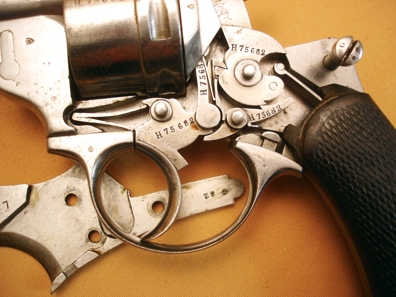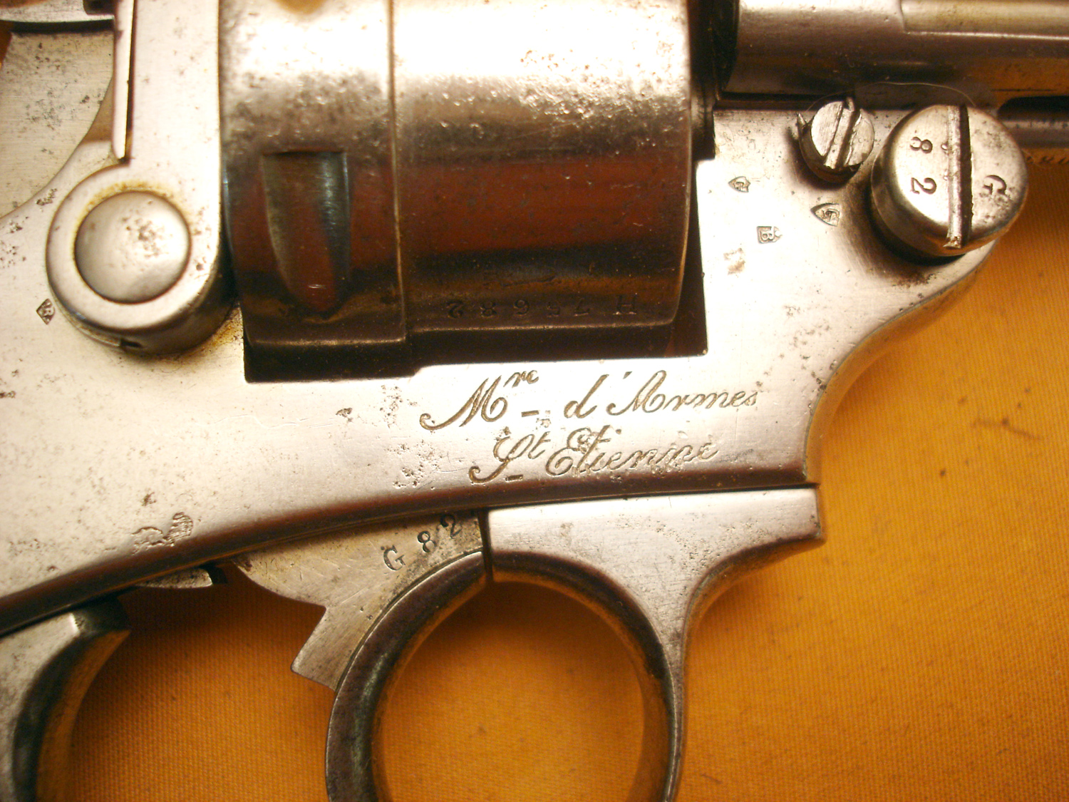 Revolver 1873, manufacture d'armes de St Etienne, daté 1882, bon mécanisme, pièces au même numéro sauf l'axe du barillet. Arme réutilisée en 1914, il a son étui jambon réglementaire, nombreux matricules sur le rabat, usure d'usage.