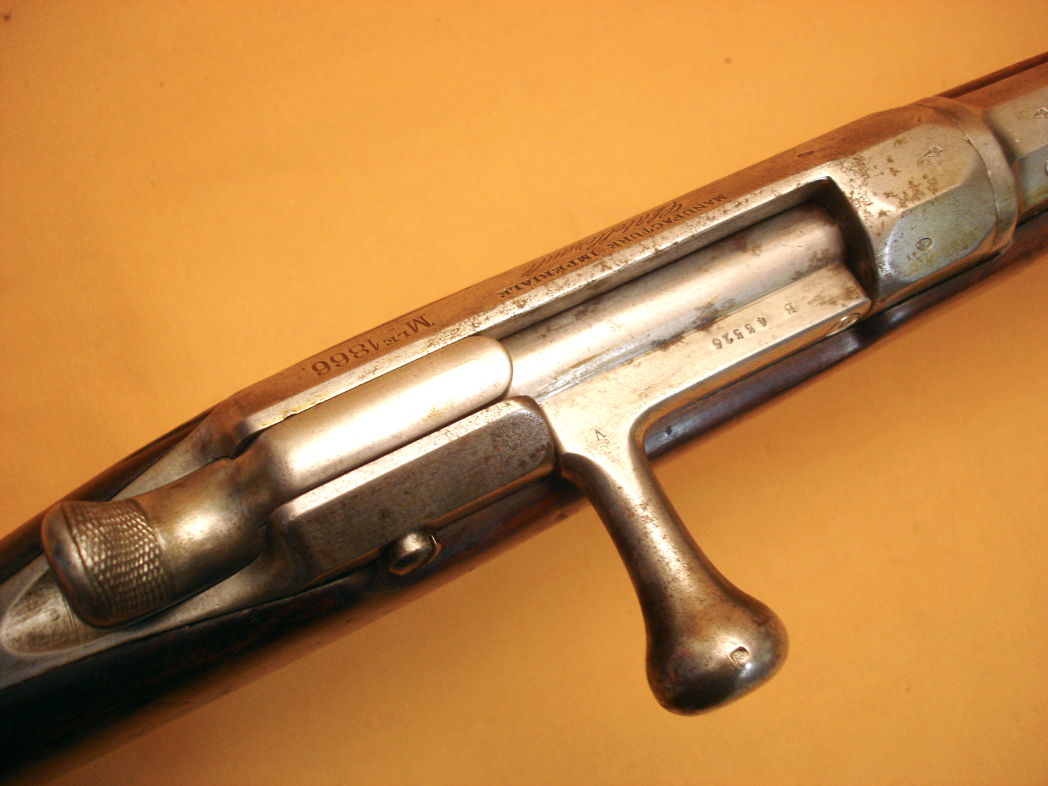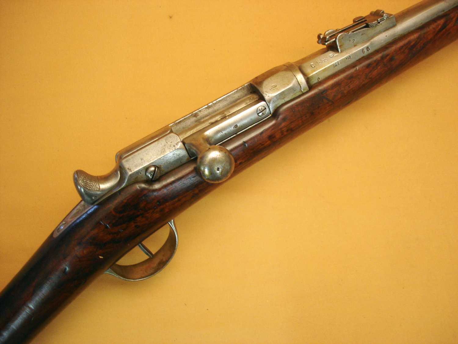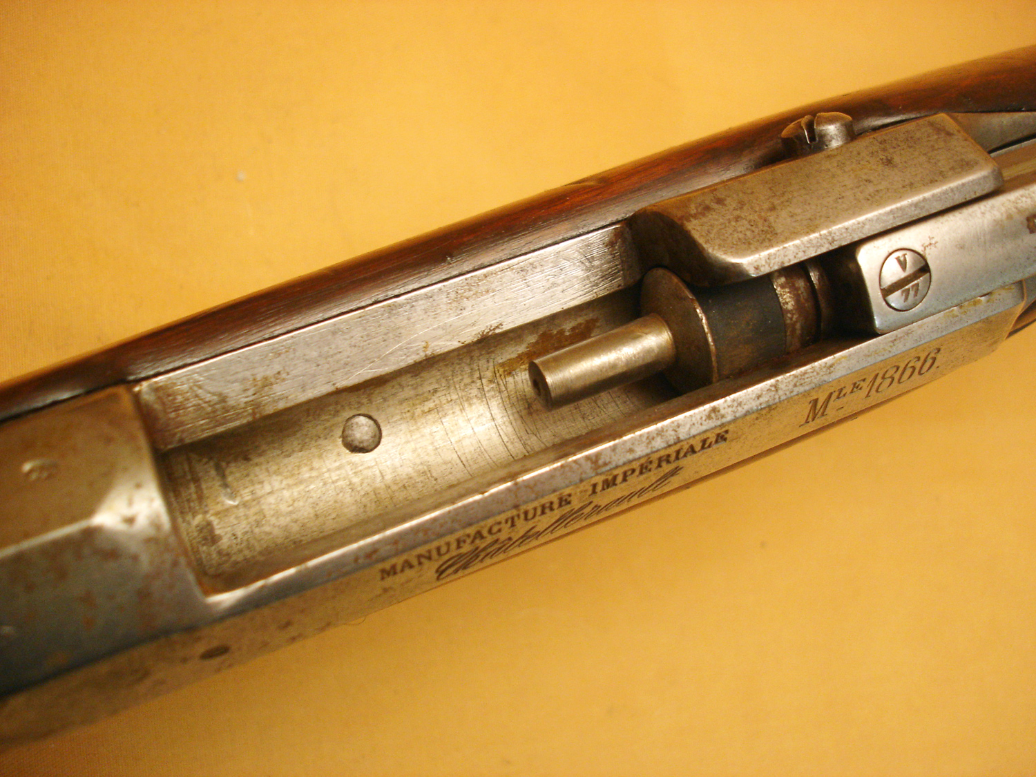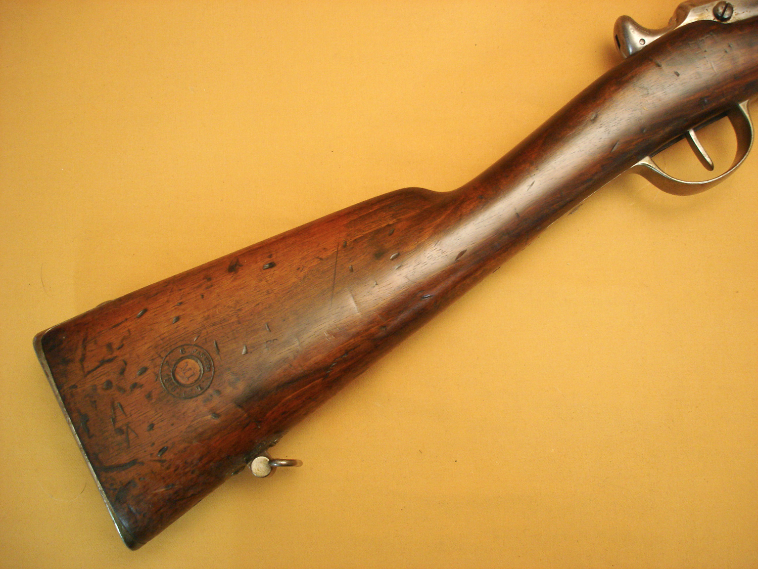 Fusil Chassepot mod.1866, Manufacture Impériale de Saint Etienne, daté 1868, beau cachet sur la crosse daté 1868, canon et mécanisme en très bon état, tout au même numéro sauf la culasse. Beau fusil Chassepot.