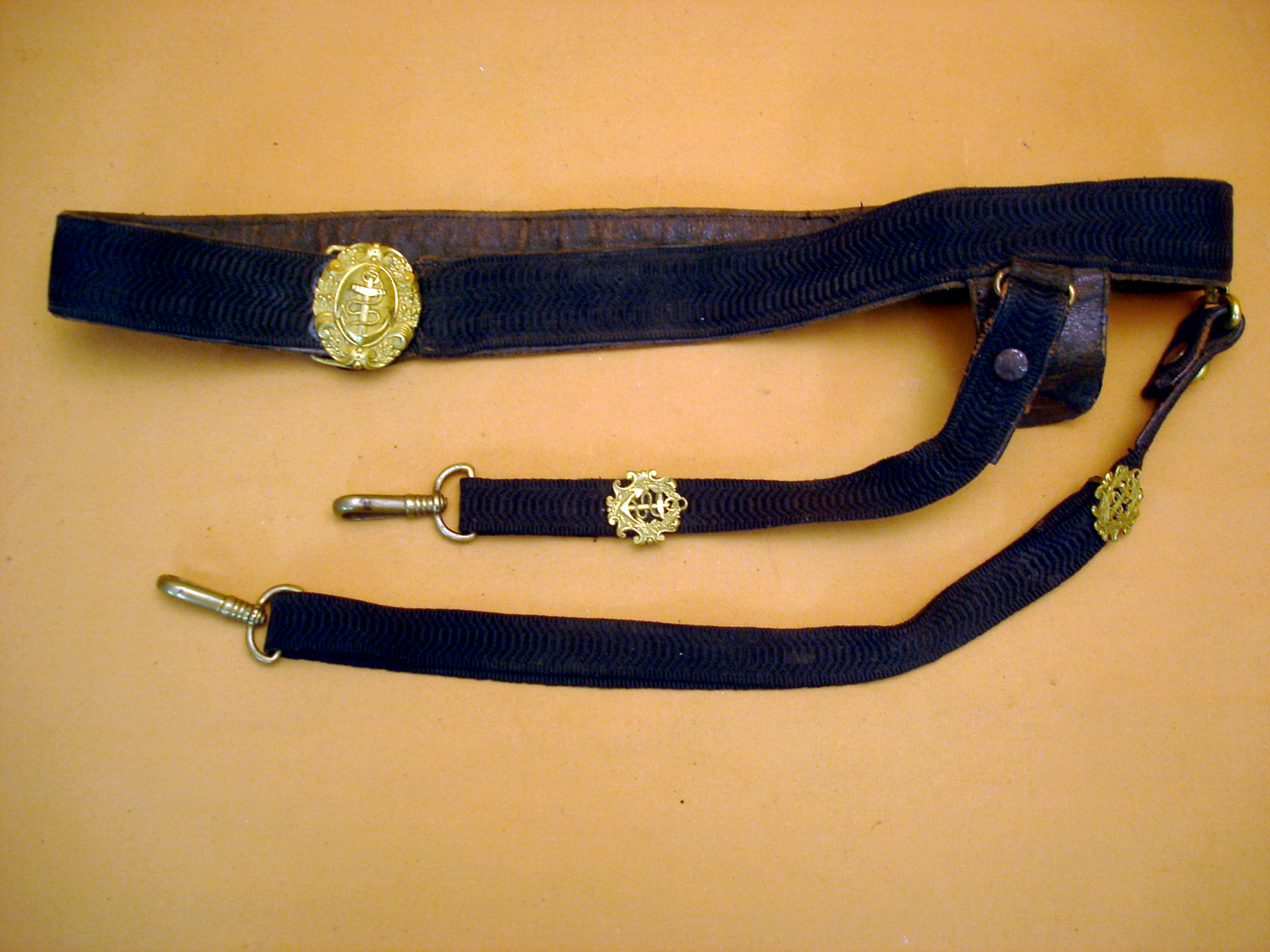 Ceinturon officier de marine, troisième République, complet, avec ses suspentes de sabres, boucle dorée doublée de maroquin rouge, patte de cuir de protection avec logo du fabricant et ancre de ...