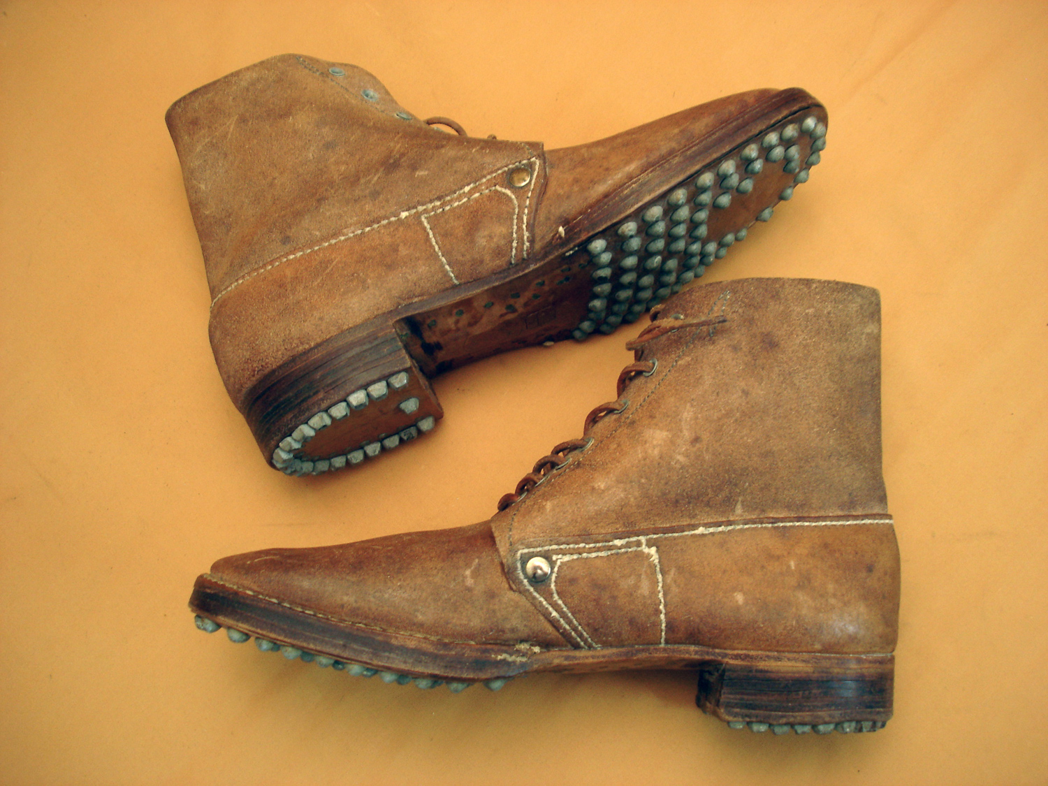 Brodequins 17 datés 1926, en cuir fauve, tampons de réception de 1924 dans chaque brodequin, nombreux marquages sous la semelle, avec les lacets cuir d'origine, bonne pointure environ 43, brodequins ...