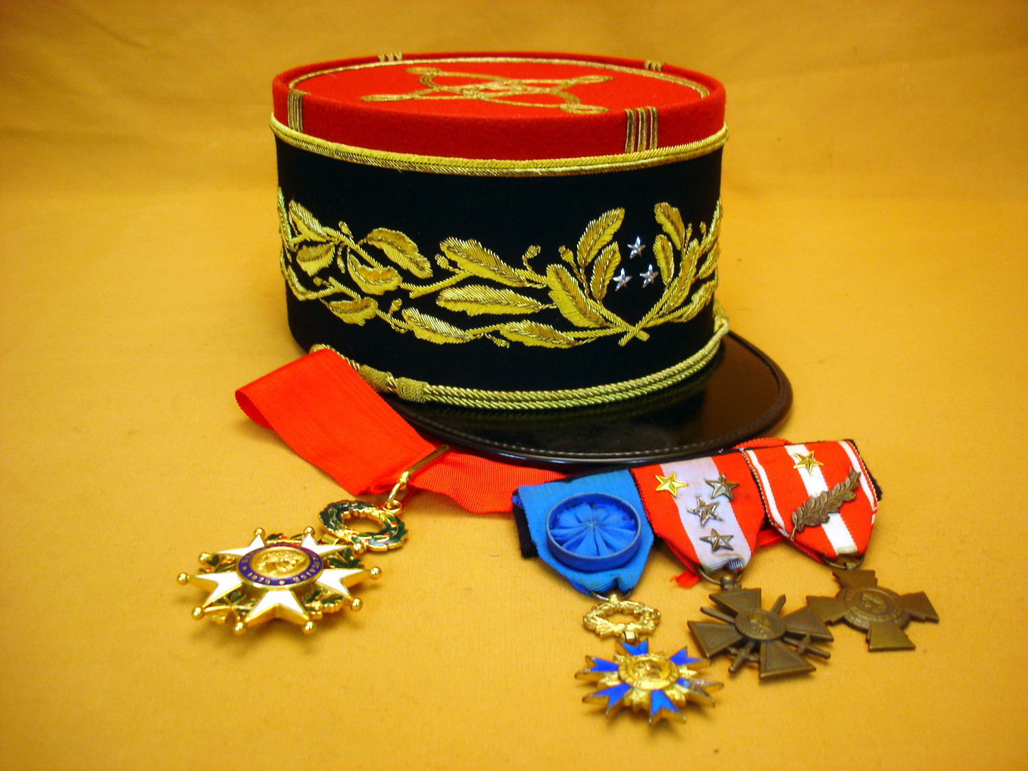 Képi et décorations de Général de Division. Ensemble nominatif d'un général de division (années 70). Le superbe képi et ses décorations : - la croix de Commandeur de la Légion d'honneur (une ...