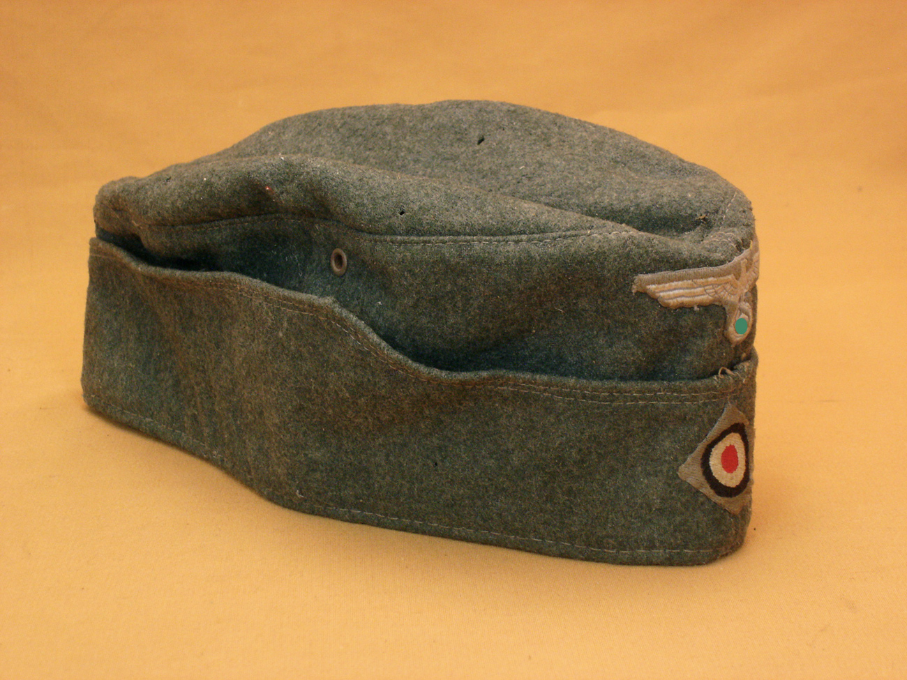 Calot troupe Wehrmacht, fabrication précoce, daté 1935, tampon du fabricant, insignes du premier type montés d'origine, dans son "jus". Prix : 350,00 € port compris pour la France.