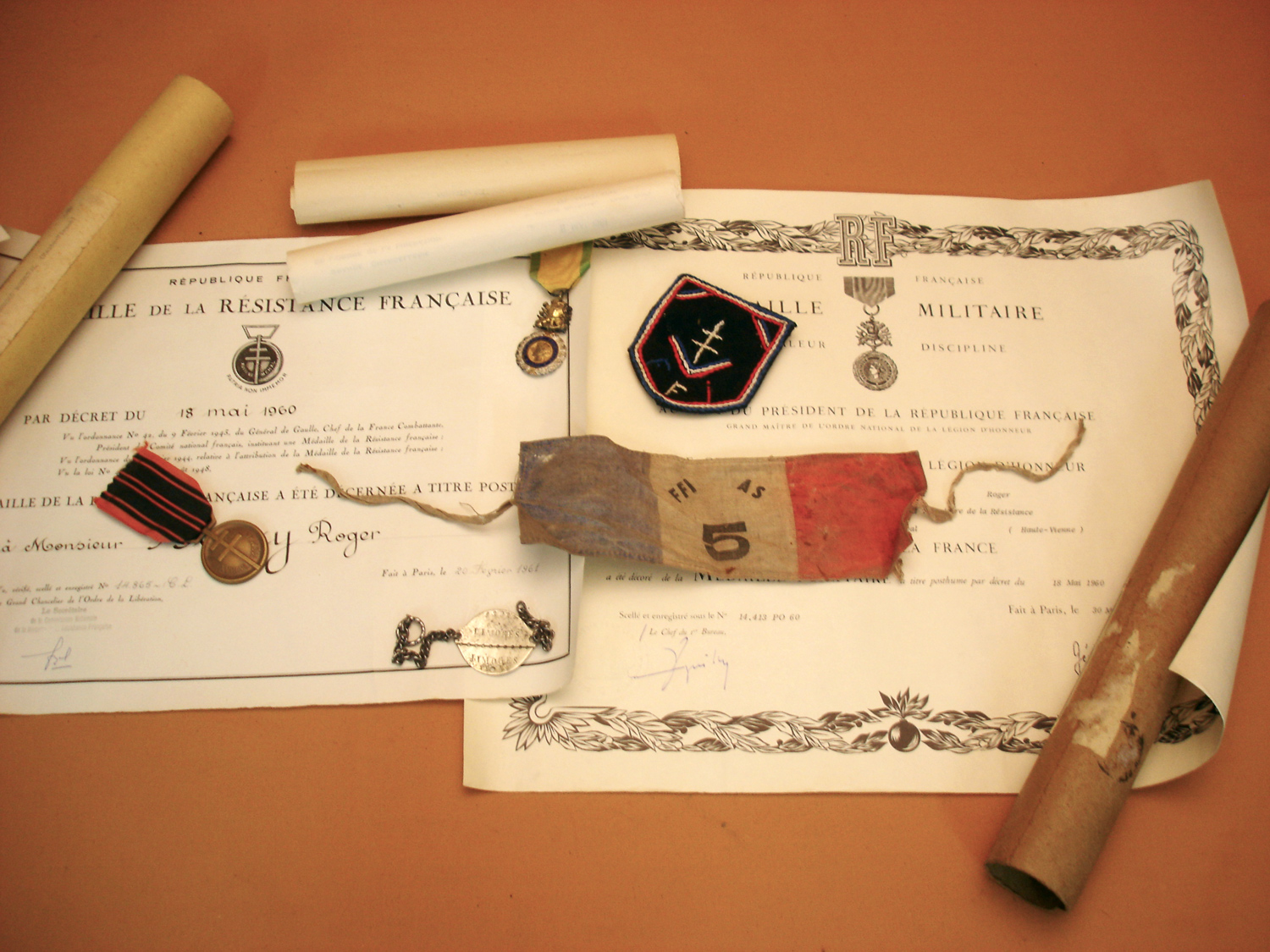 Ensemble FFI du maquis du Limousin, comprenant : - le brassard FFI AS Région 5. - l'insigne de poitrine FFI, en tissu brodé. - la médaille de la résistance avec son diplôme. - la médaille ...