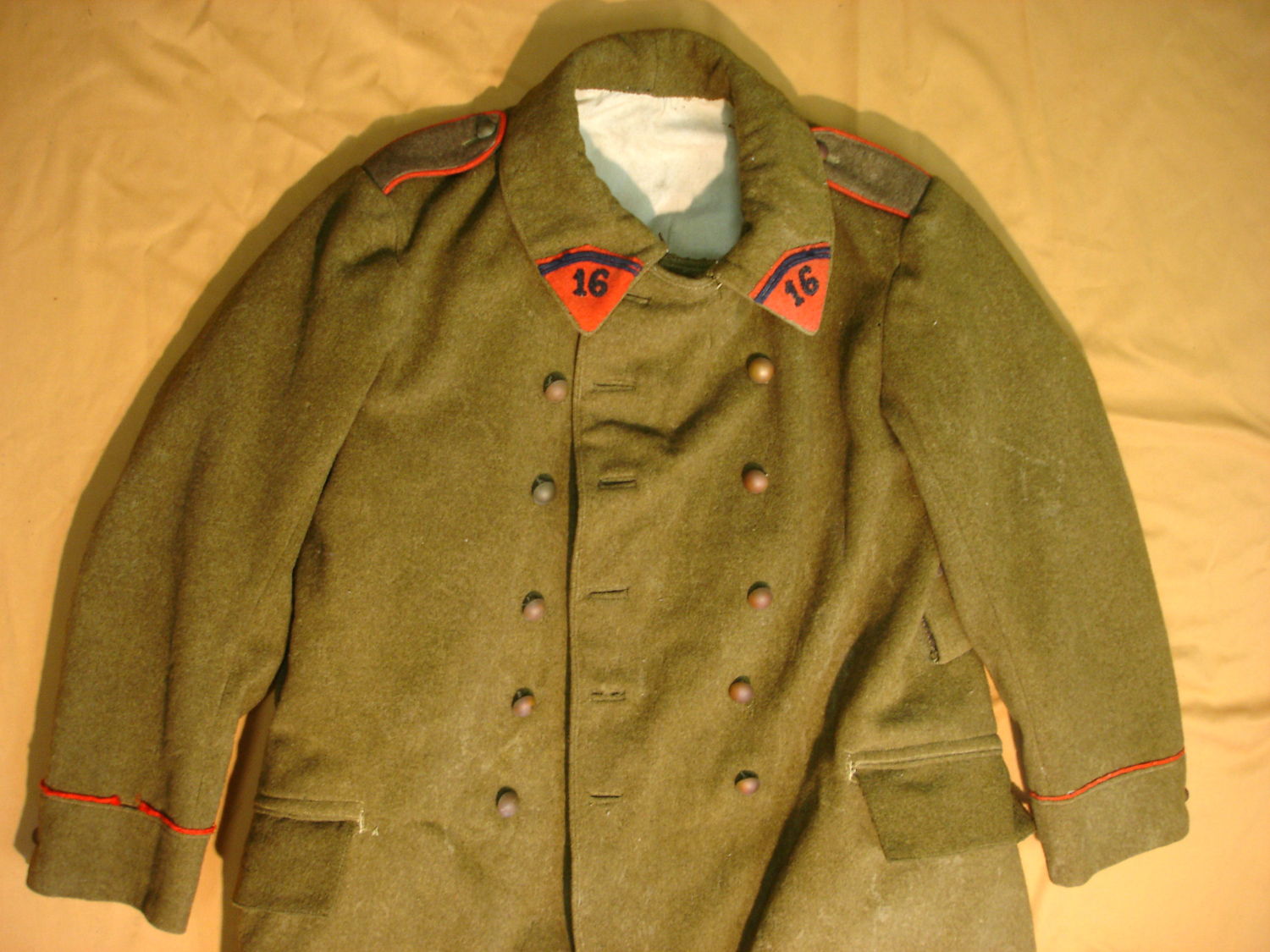 Capote 1922 du 16e d'artillerie. Capote troupe en drap kaki moutarde, pattes de col d'origines du 16e d'artillerie, doublure réglementaire en drap blanc, nombreux marquages, tampon du fabricant de ...