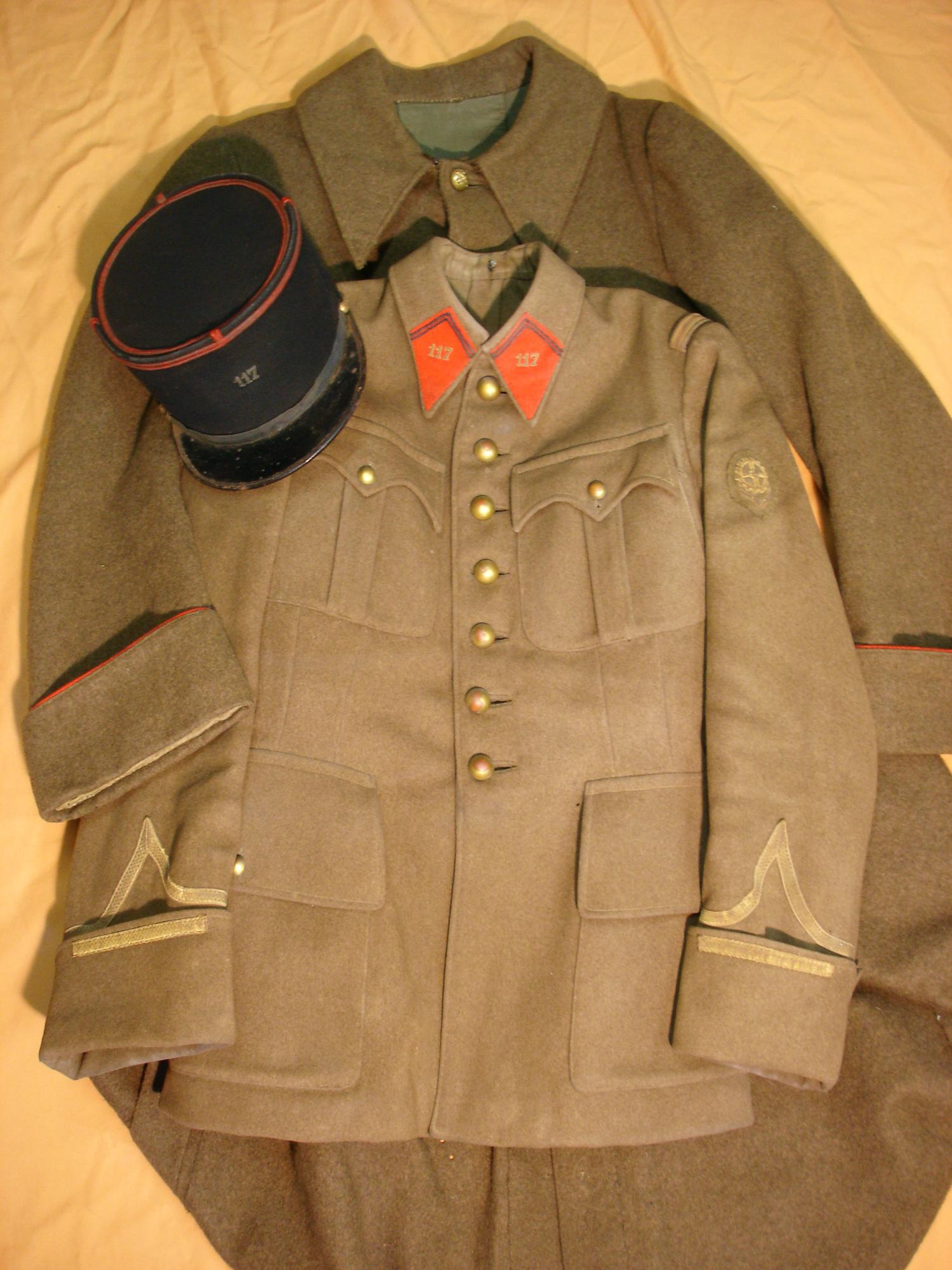 Tenue du 117 RAL en 1940, comprenant : - la veste en drap troupe d'un sergent du 117 RA, pattes de col d'origine, galons de manche. - le képi du 117 RA, numéro brodé cannetille, logo du fabricant à ...