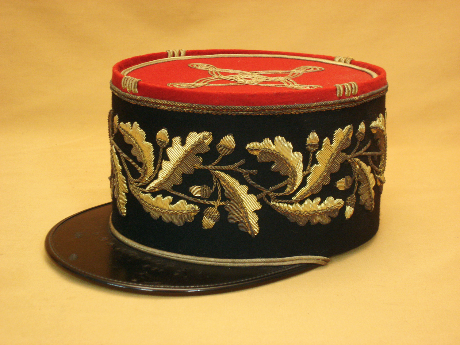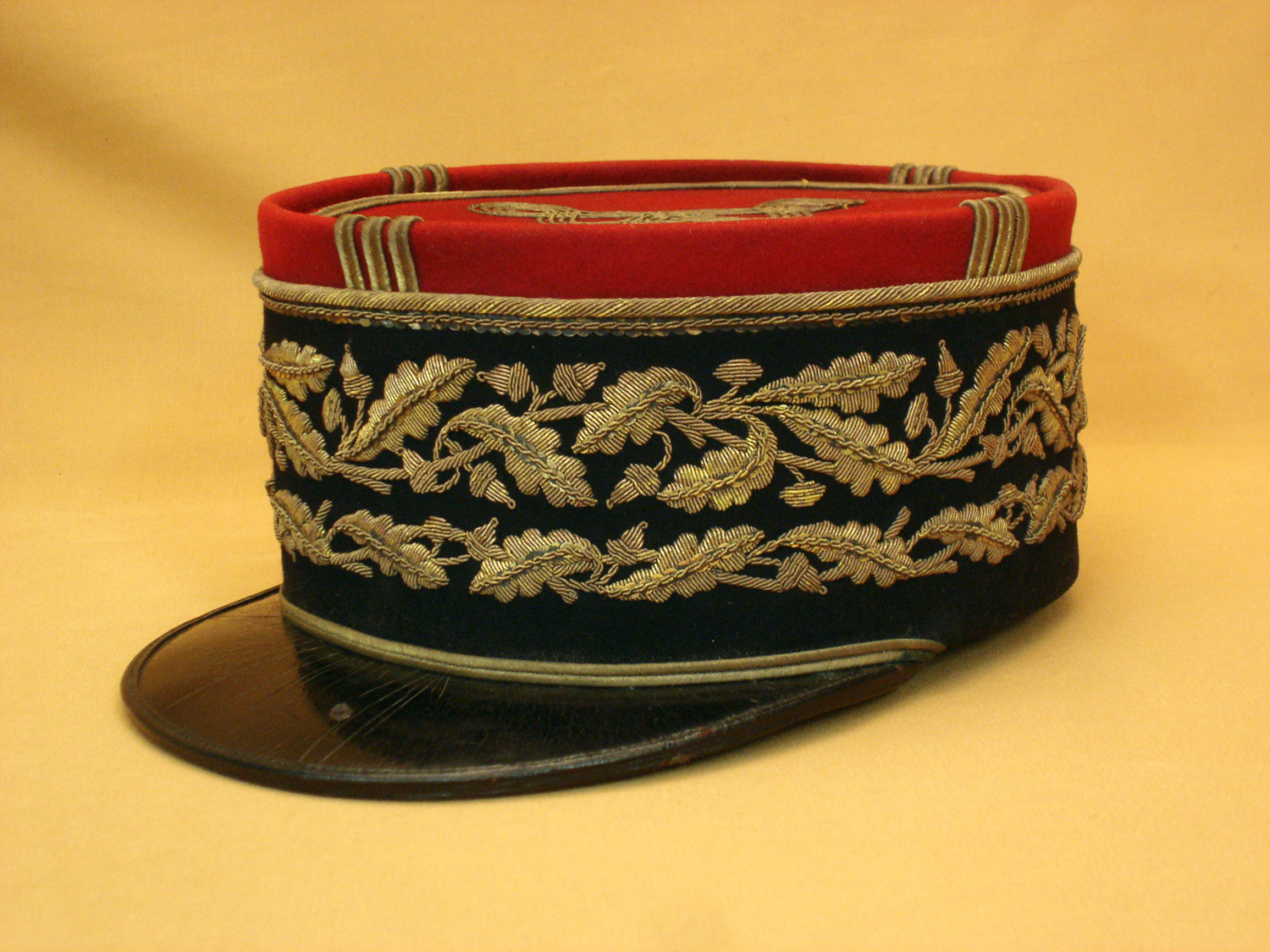 Képi de Général de brigade mod.31, bandeau brodé de feuilles de chêne et de glands en cannetille d'or, fabrication des années 45/50, logo du fabricant "Peris à Marseille", usure d'usage, en très bon ...