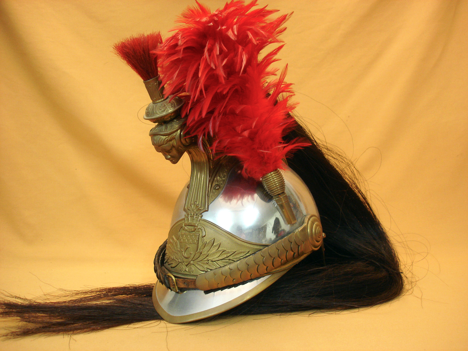 Casque de la Garde Républicaine à cheval, modèle 1876, type 1927-1933. Casque en acier nickelé, bandeau avec les armes de la ville de Paris avec la légion d'honneur et la croix de guerre de 1914. ...