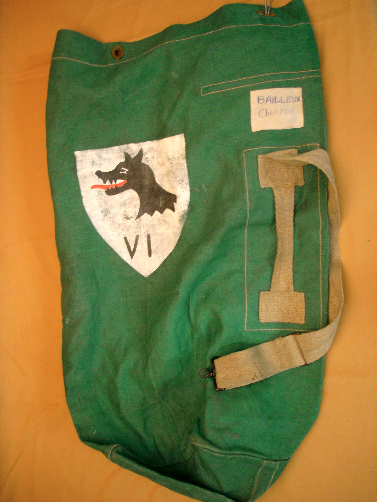 Sac paco du 6e groupement CJF, sac toile couleur verte des Chantiers de Jeunesse, insigne peint du 6e groupement "De Gevaudan" et étiquette nominative cousue sur le sac. Rare sac des CJF. Prix : ...