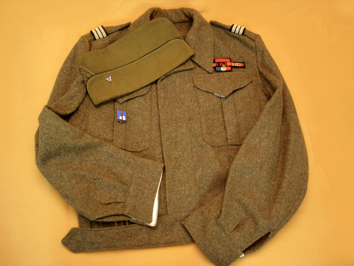 Blouson et calot maquis Bir Hacheim, maquis de la Charente. Blouson mod.44 fabriqué à Limoges en mars 1945, grade de capitaine, insigne émaillé sur la poitrine du maquis Bir Hacheim, barrette de ...