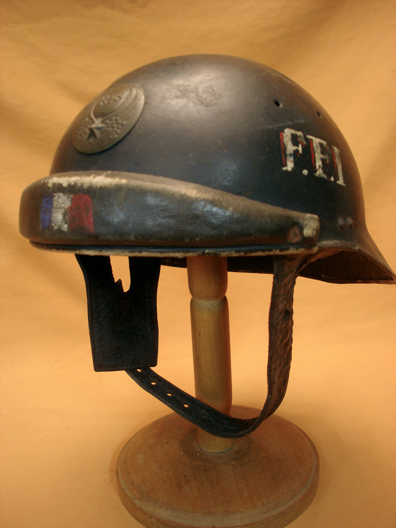 Casque mod.35 FFI, casque 35/37 de l'armée de l'air, attribut mod.37 de l'aviation, coiffe cuir noir datée 1939, casque récupéré par les maquis de Dordogne, drapeau tricolore peint sur le bandeau et ...