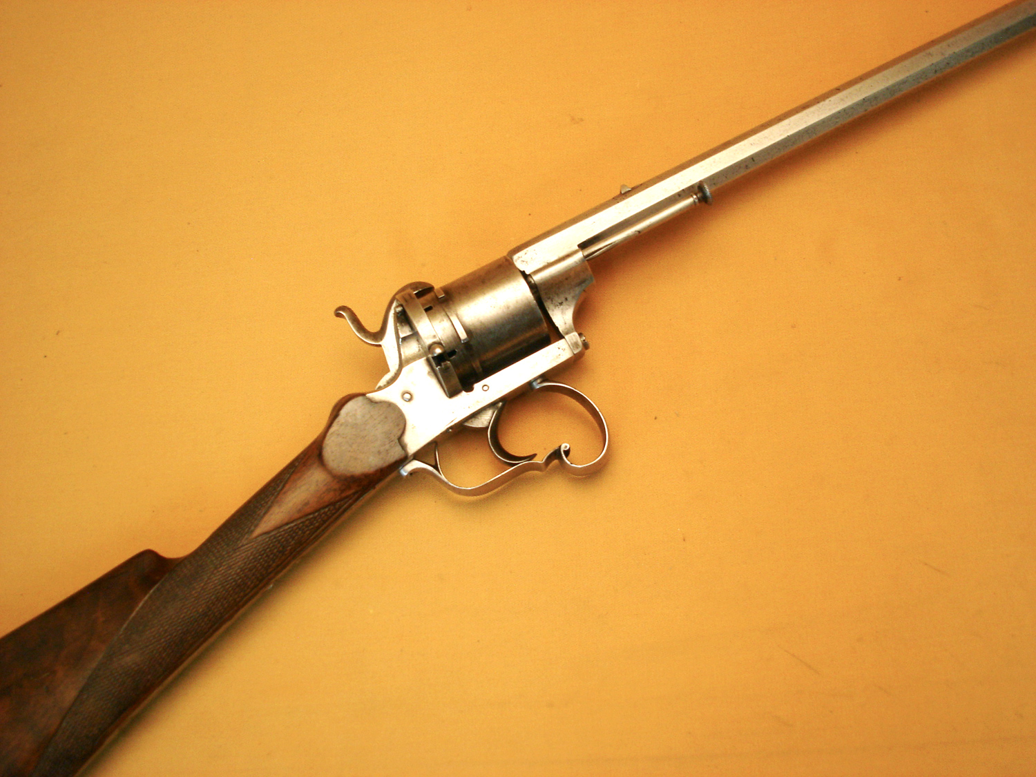 Carabine révolver à broche, type Lefaucheux 1854, calibre 12mm, poinçon de Liège sur le barillet, bon mécanisme, très belle crosse bois, longueur totale 102 cm, longueur du canon 60 cm. Rare carabine ...