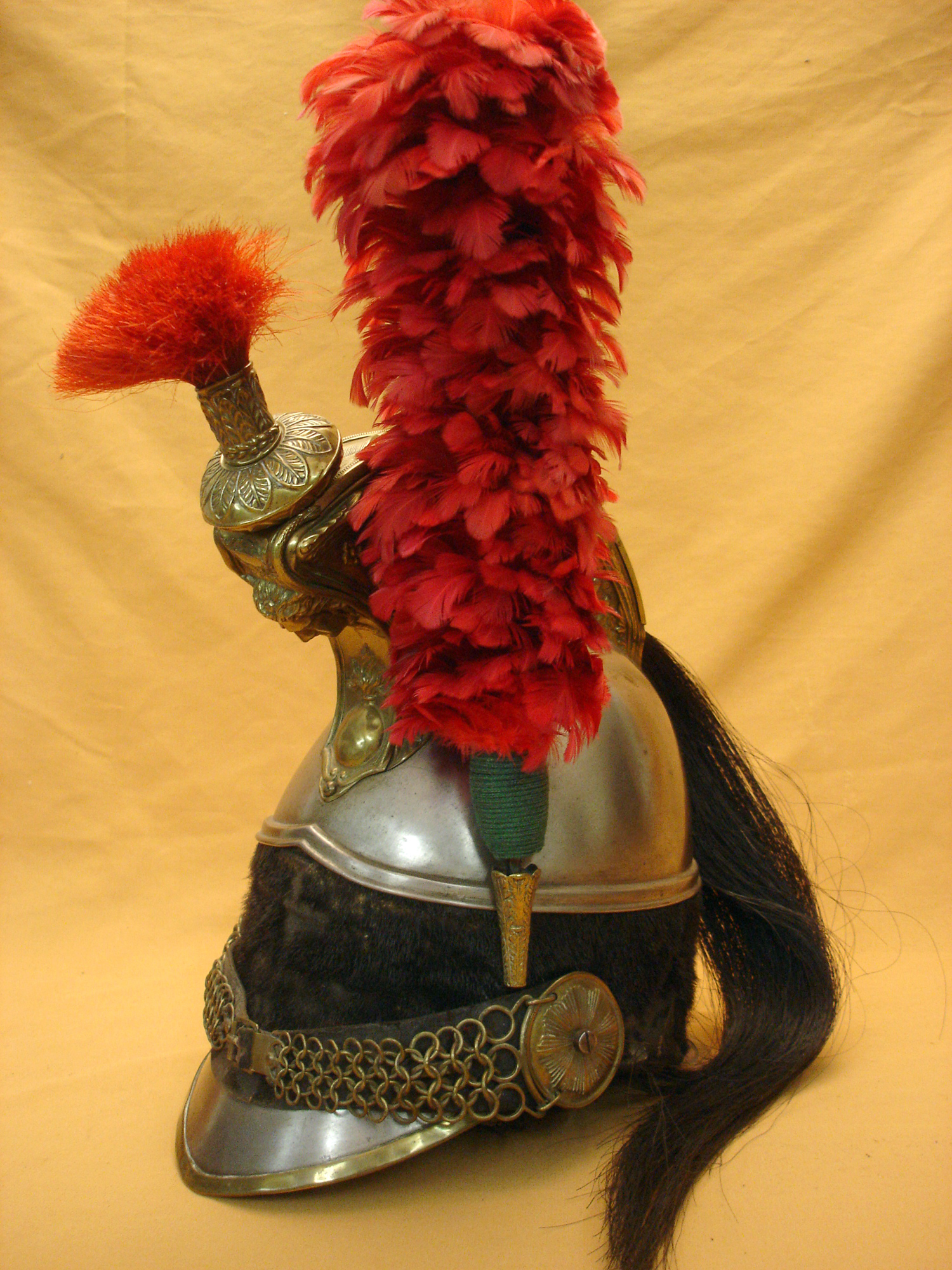 Casque d'officier de Dragon mod.1874, bombe, visière et couvre nuque argenté, bandeau et cimier en dorure, complet avec sa jugulaire d'officier, sa coiffe cuir noir doré au fer, belle crinière, Très ...