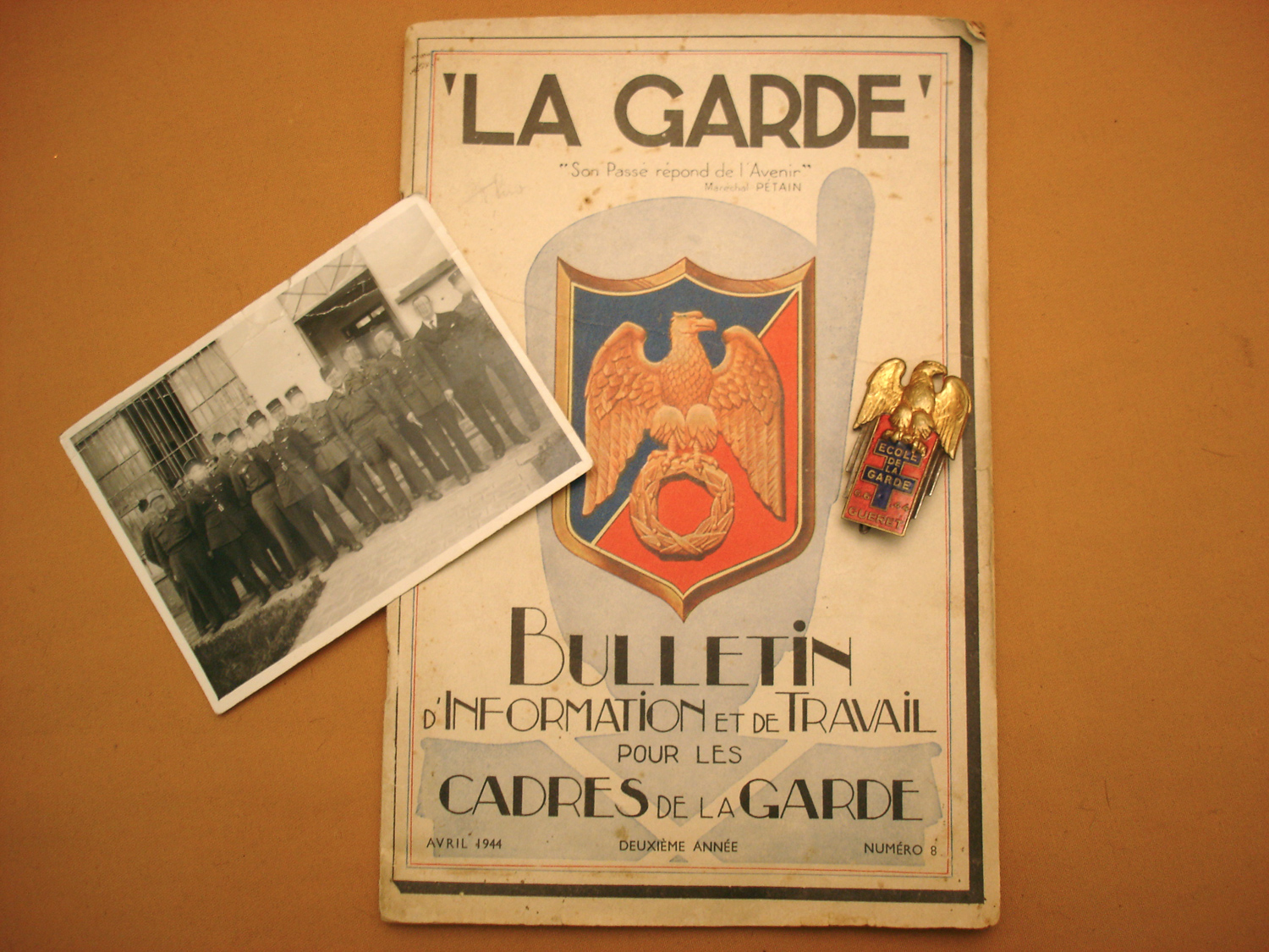 Insigne et papiers de l'École de la garde de Guéret 1944. Insigne de l'école de Garde de Guéret avec la photo nominative du gendarme et le livret "Bulletin des cadres de la Garde" d'avril 1944. Rare ...