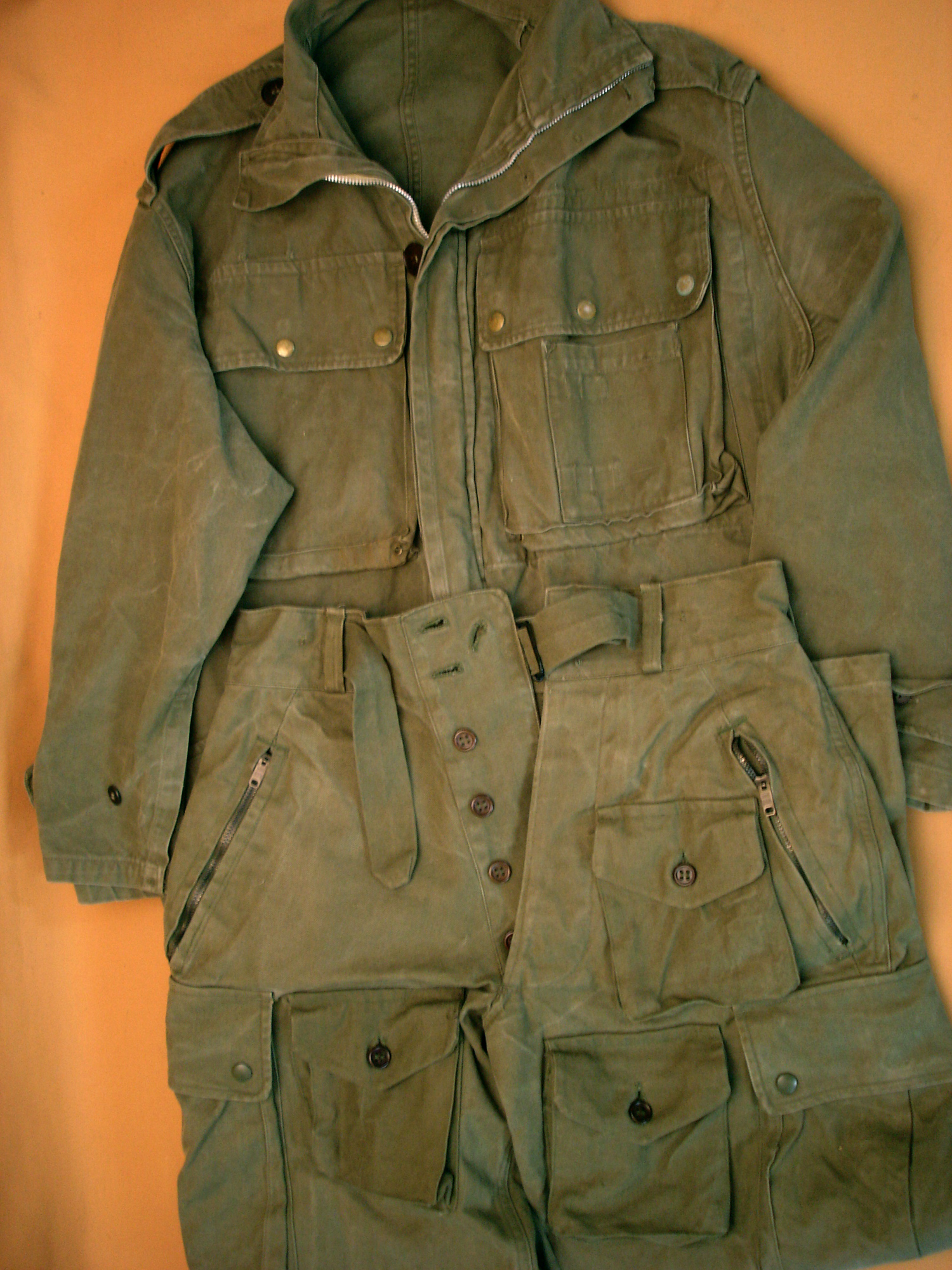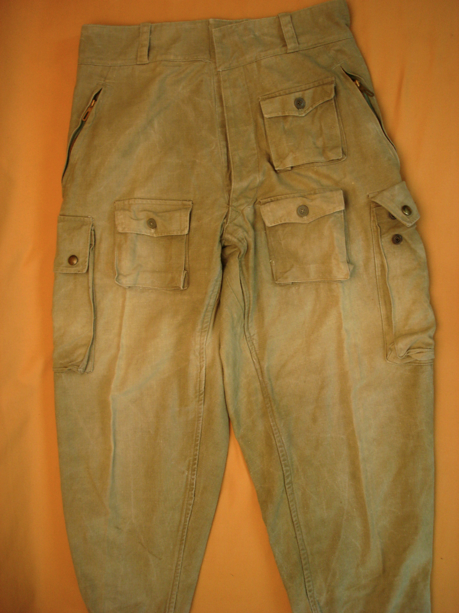 Pantalon de Parachutiste mod.47 Indochine, en toile verte, poches latérales avec boutons pression, les trois petites poches avec boutons classiques, les fermetures éclair des deux poches fonctionnent ...