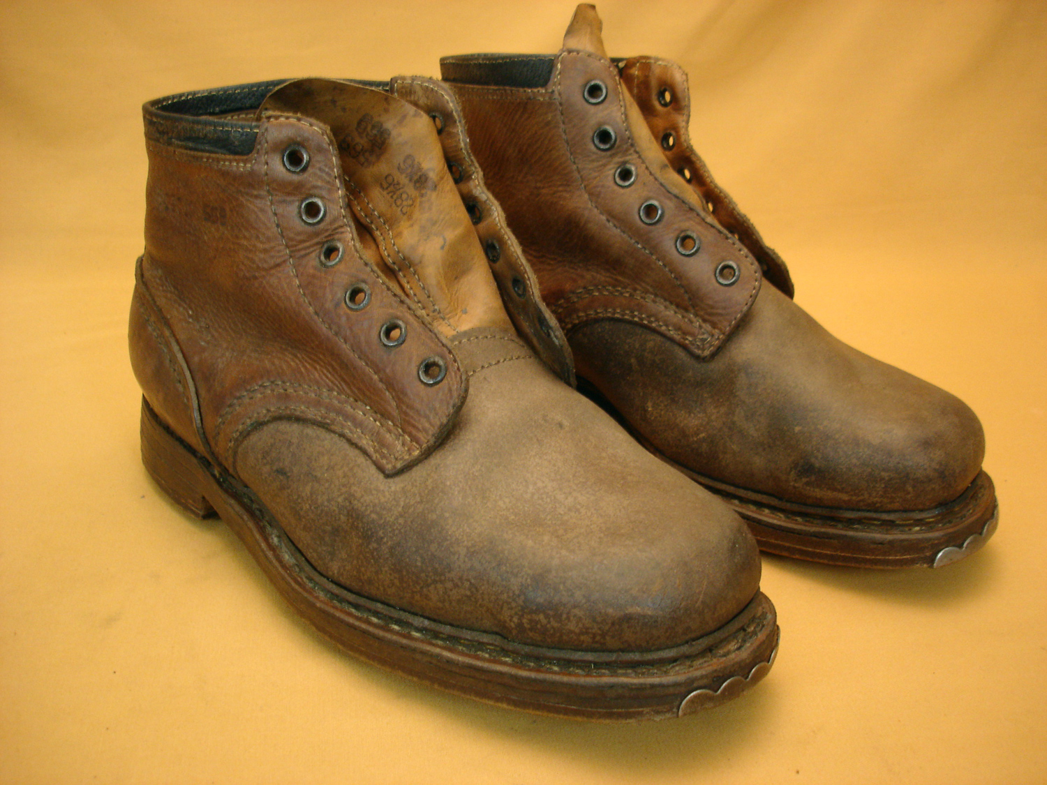 Brodequins Gebirgsjäger réutilisés Français, modèles réglementaires allemands, semelles d'origine avec cloutages allemands, marquages Wehrmacht sur le cuir extérieur et à l'intérieur, tampons de ...