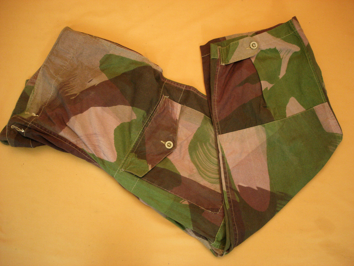 Pantalon camouflé "peau de saucisson", poche de cuisse à rabat, deux poches latérales, pattes de serrage au bas des jambes, belles couleurs, bonne taille, longueur 105 cm. Très bon état. Prix : ...