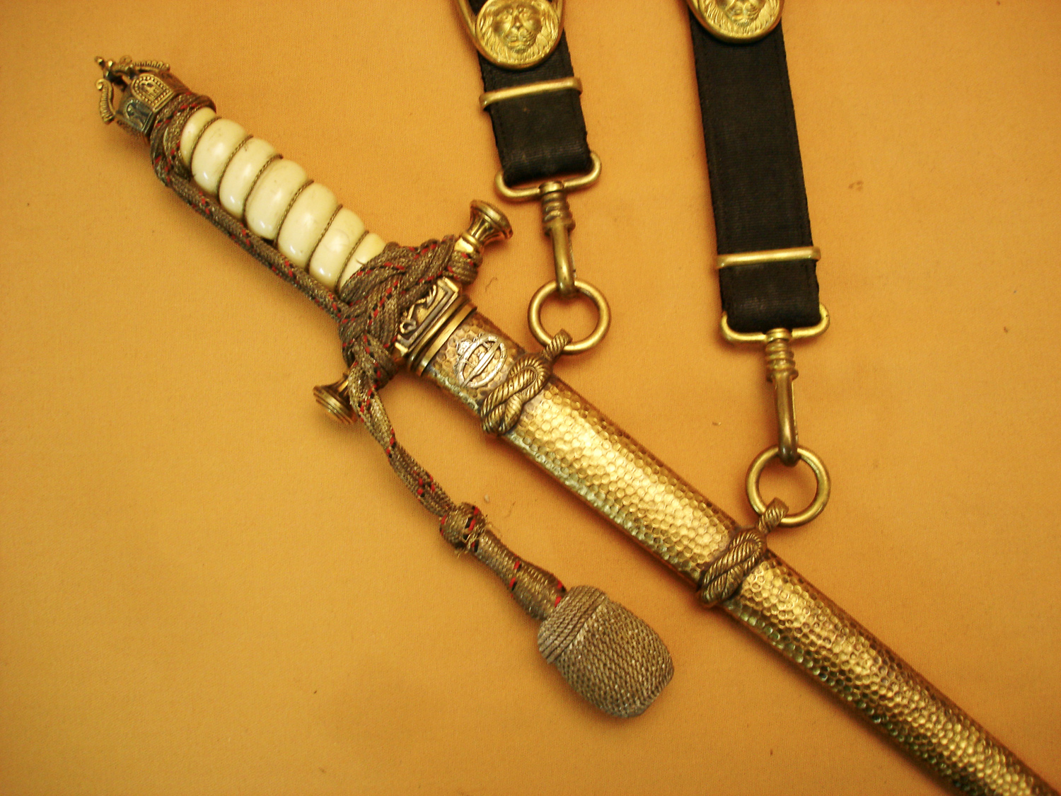 Rare dague Reichsmarine d'un officier U.Boot, fabrication Eickhorn Solingen, très belle lame gravée et dorée, fourreau martelé, bracelets au motif de cordage, petit brevet de sous marinier argent sur ...