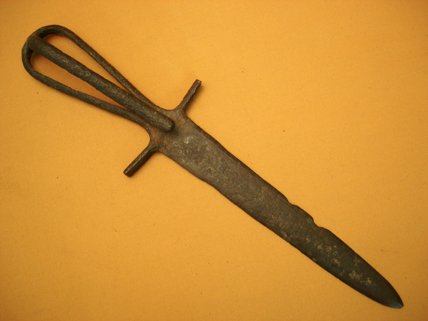 Dague à rouelles du XVe siècle, lame de section carrée, garde et pommeau rond, fusée de la poignée cassée et restaurée anciennement, peu visible. longueur totale 29,5 cm. Rare dague médiévale. Prix ...