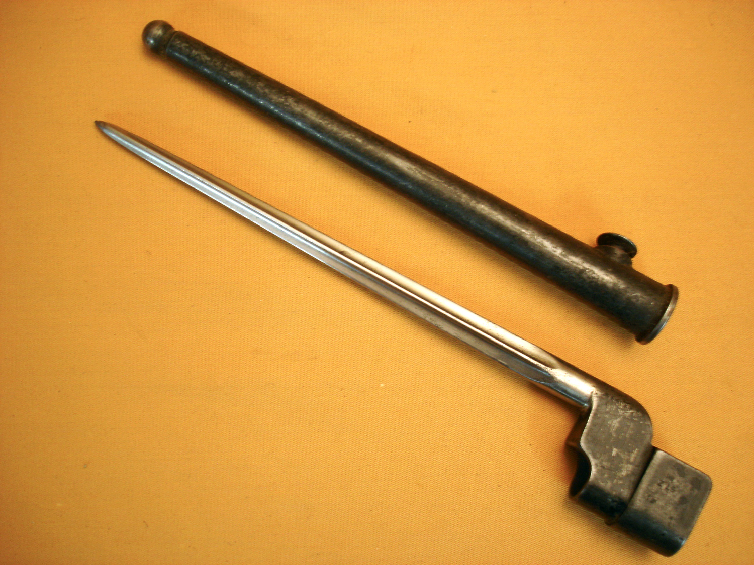 Baïonnette clou Enfield, cruciforme. Très belle lame cruciforme, baïonnette marquée N°4 MK 1 et SM pour le fabricant "Singer Manufacturing" avec son fourreau marqué sur la cuvette N°4 MK 1. ...