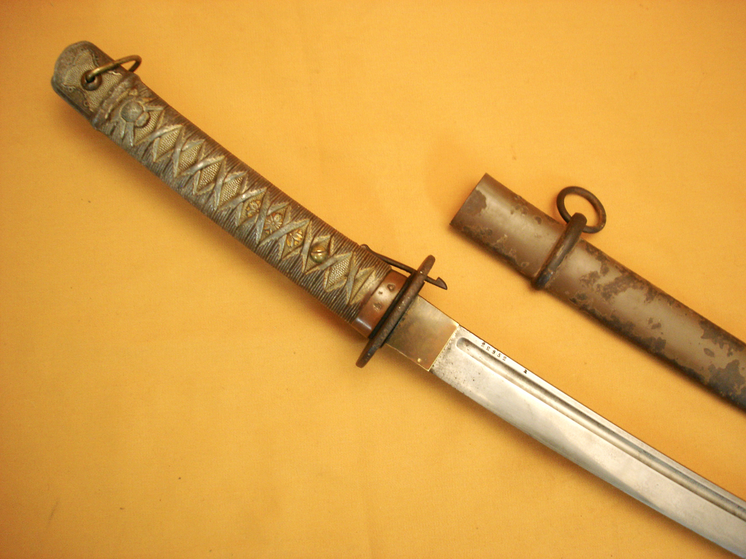 Sabre Japonais Katana 1943, type 95, poignée alu, tsuba en fer, belle lame avec numéro, avec son fourreau fer peint, la cuvette d'entrée du fourreau est manquante. Arme dans son "jus", ...