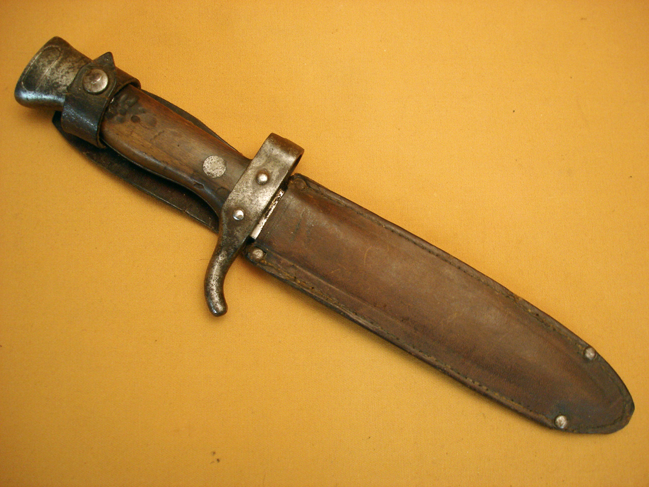 Baïonnette de Mousqueton 92, modèle sans quillon, belle lame bronzée, plaquettes bois, avec son porte baïonnette en cuir fauve, dans son" jus". Prix : 125,00 € port compris pour la France.