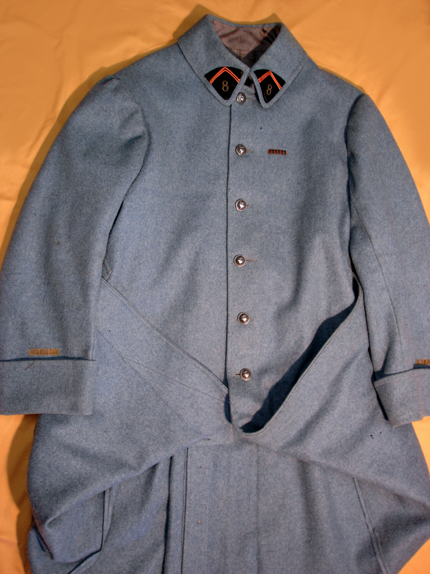 Capote bleu horizon du 8e Génie, manteau en drap troupe pour un sous lieutenant, pattes de col d'origine du 8e Génie, boutons du Génie peints bleu horizon, drap très frais. Très belle capote. Prix ...