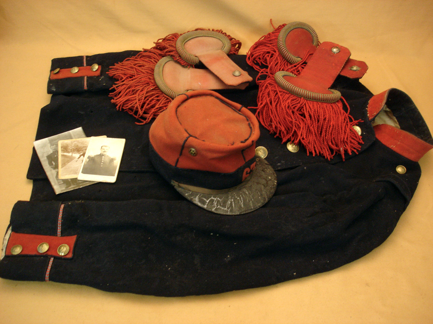 Ensemble nominatif d'un soldat du 63e RI en 1914, comprenant : - le képi 1884, réglementaire, petite jugulaire dorée montée pour l'adjudant, numéro 63 d'origine. - la veste d'adjudant, doublure de ...