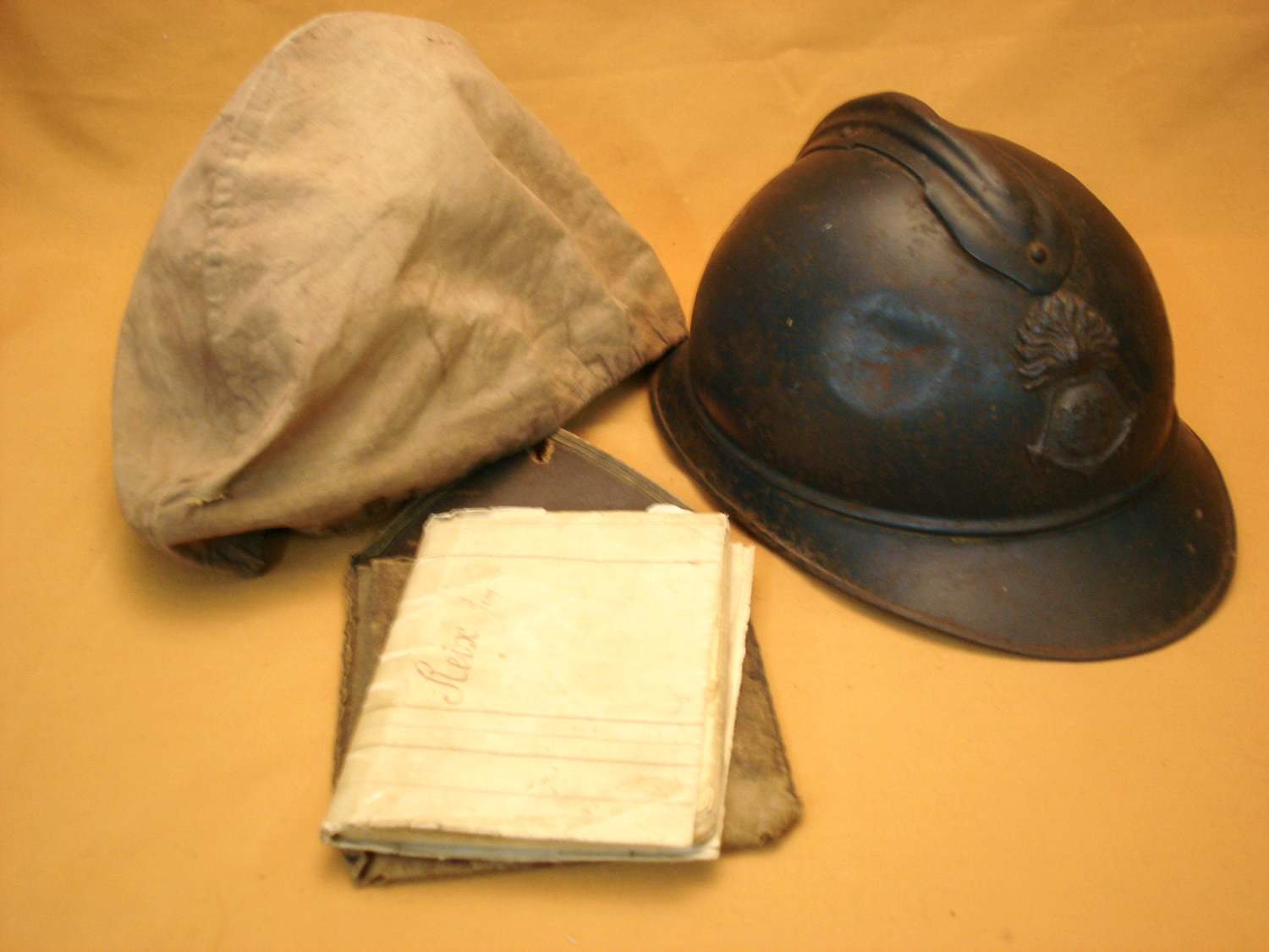 Ensemble casque avec couvre casque et papiers du 7e RIC. Casque Adrian 1915 infanterie coloniale, bleu horizon, complet avec sa coiffe cuir du 1er type et sa jugulaire, il a son rare couvre casque ...