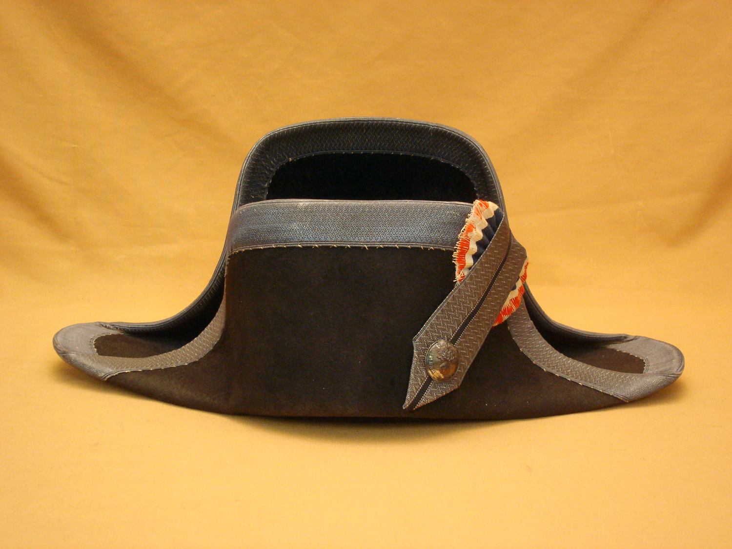 Bicorne de Gendarme mod.1895, cocarde tricolore, bandeau de coiffe en basane noire, étiquette du fabricant à l'intérieur, en très bon état. Prix : 320,00 € port compris pour la France.