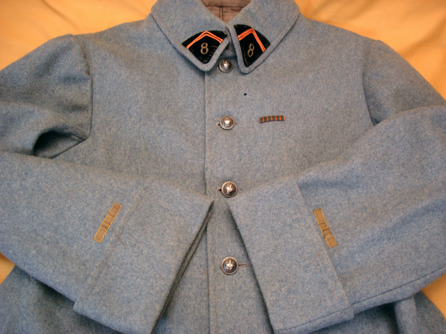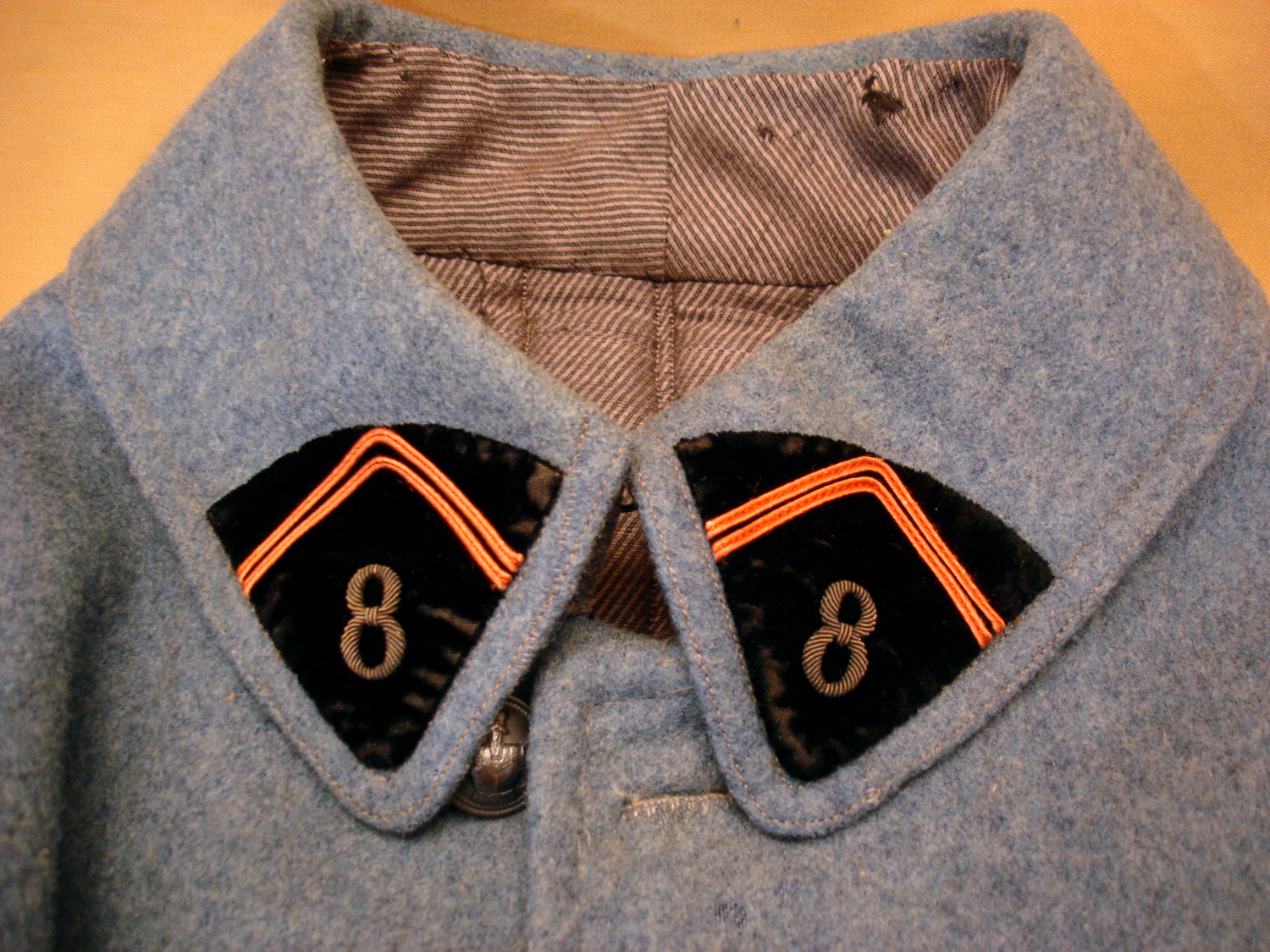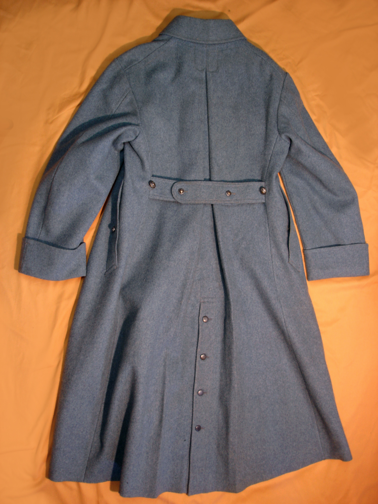 Capote bleu horizon du 8e Génie, manteau en drap troupe pour un sous lieutenant, pattes de col d'origine du 8e Génie, boutons du Génie peints bleu horizon, drap très frais. Très belle capote.