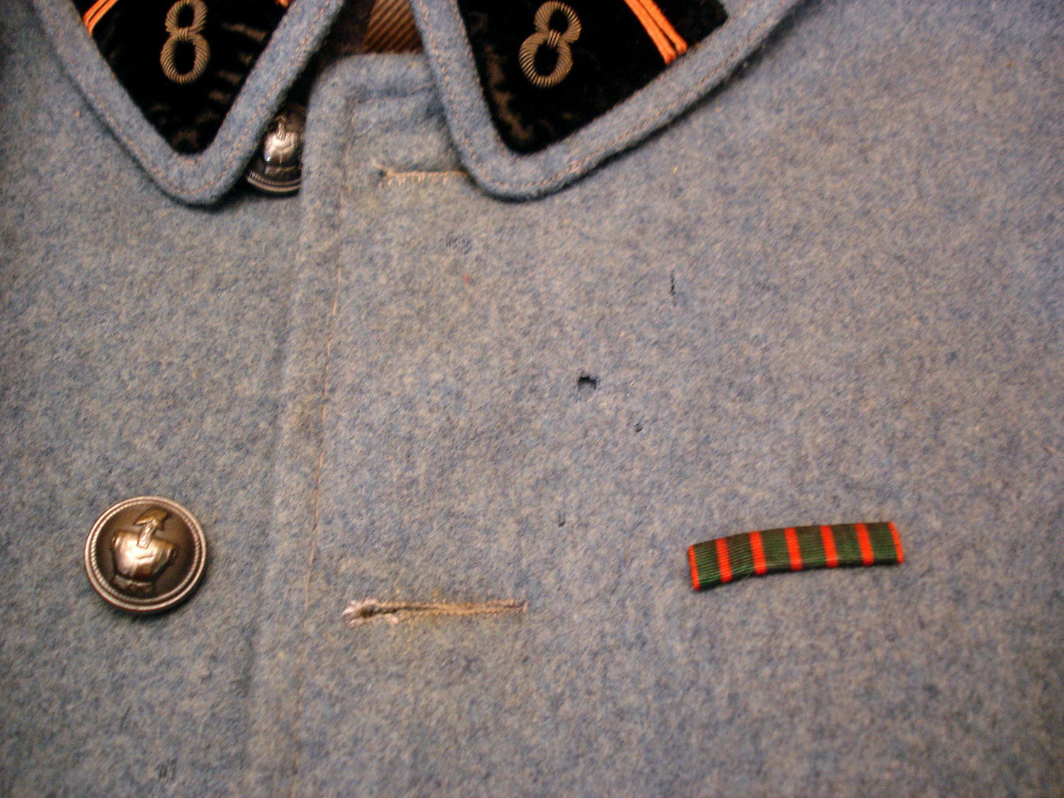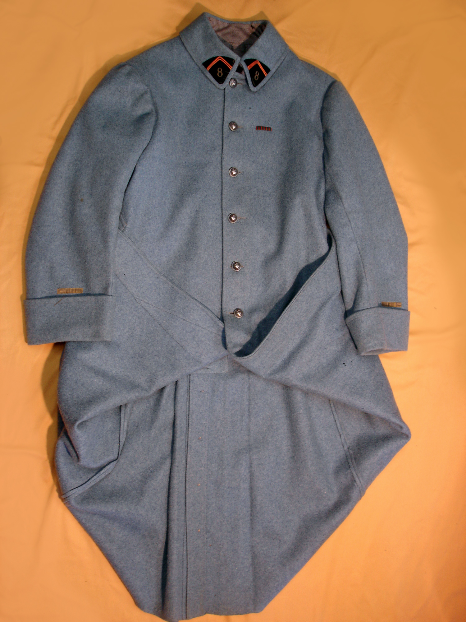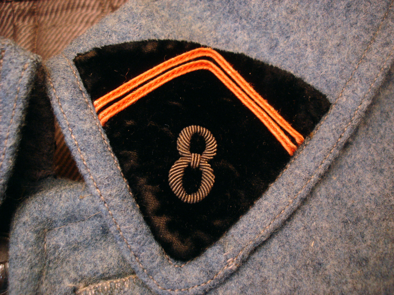 Capote bleu horizon du 8e Génie, manteau en drap troupe pour un sous lieutenant, pattes de col d'origine du 8e Génie, boutons du Génie peints bleu horizon, drap très frais. Très belle capote.
