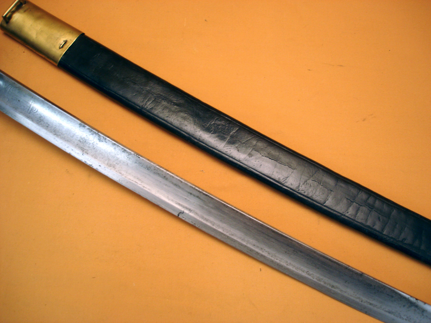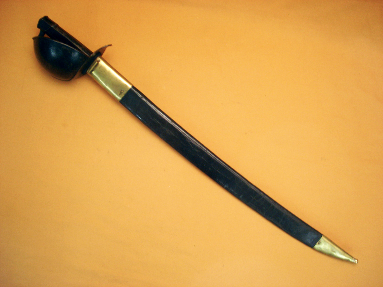 Sabre d'abordage mod.1833, belle lame avec ses deux ancres gravées, marqué "Manufacture Royale de Châtellerault Avril 1847", poignée noire, avec son fourreau cuir à garnitures laiton, ancre de marine sur la cuvette. Beau sabre 33 de Marine.