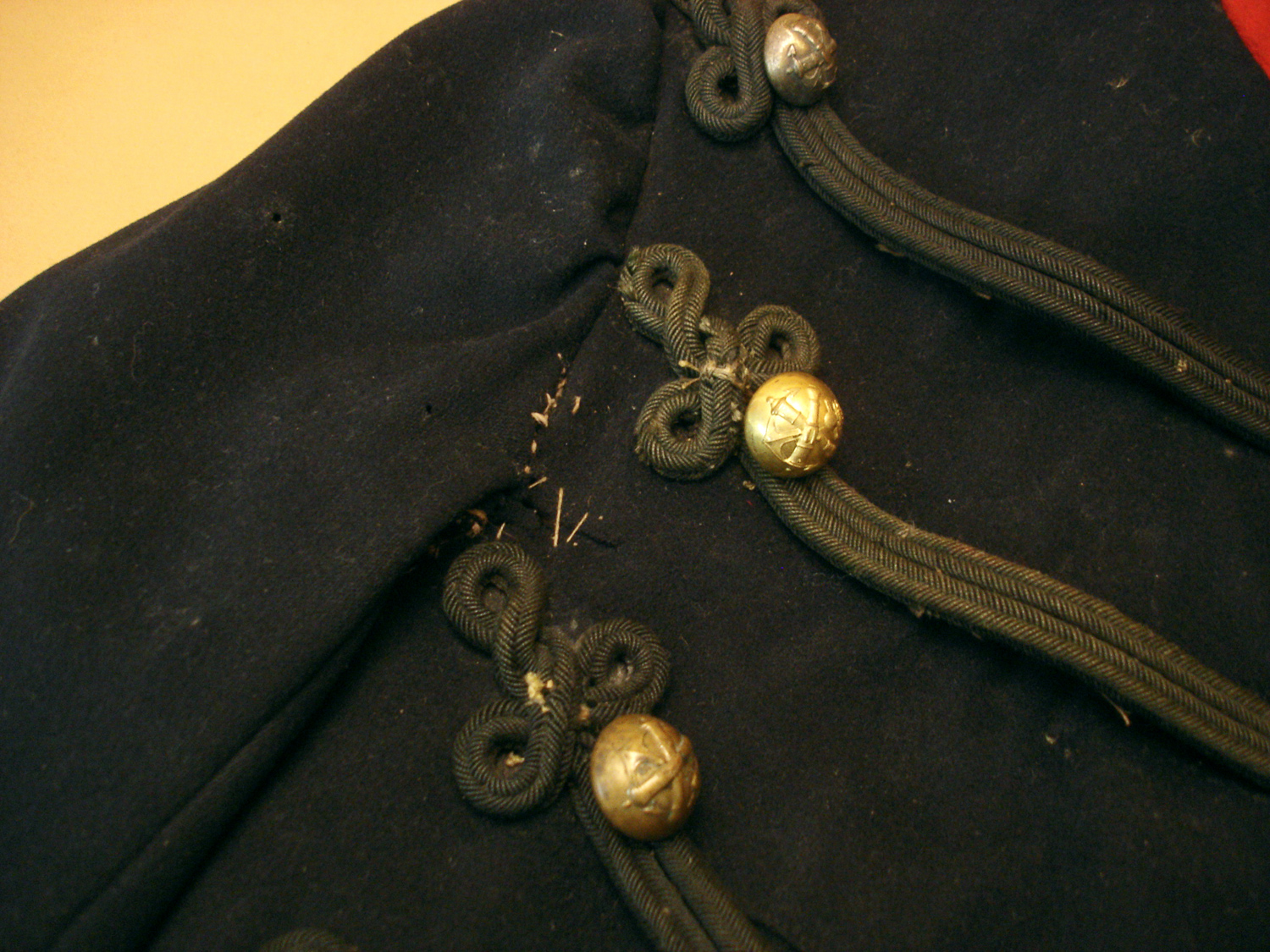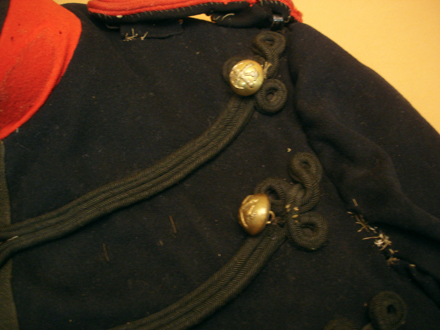 Dolman d'artillerie coloniale mod 1872, drap bleu foncé, brandebourgs noirs, avec ses boutons de l'artillerie coloniale, une grenade de col est manquante, drap en bon état, quelques boutons ont été recousus, usure d'usage.