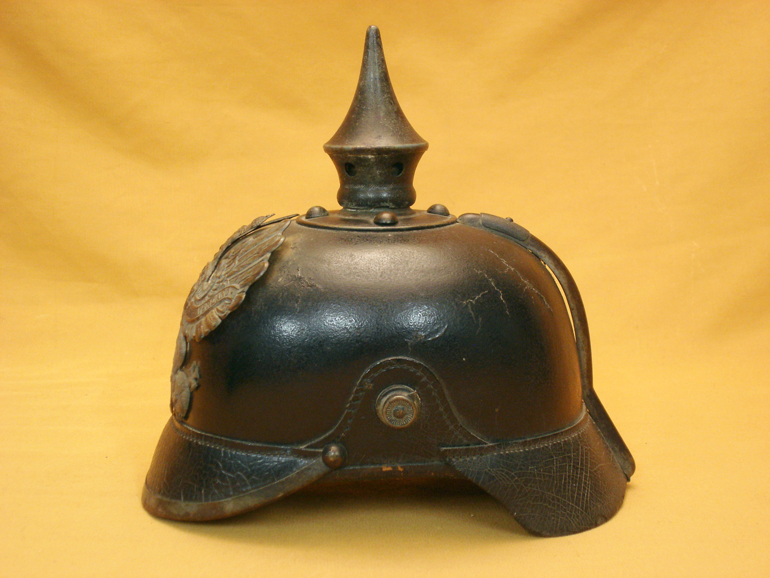 Casque à pointe Prussien 1915, plaque d'origine jamais démontée, tampon BA IV, IV Armee-korps (Magdebourg) sur la nuquière. Les cocardes et la jugulaire sont manquantes. Casque dans son "jus", jamais nettoyé.
