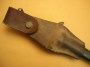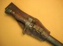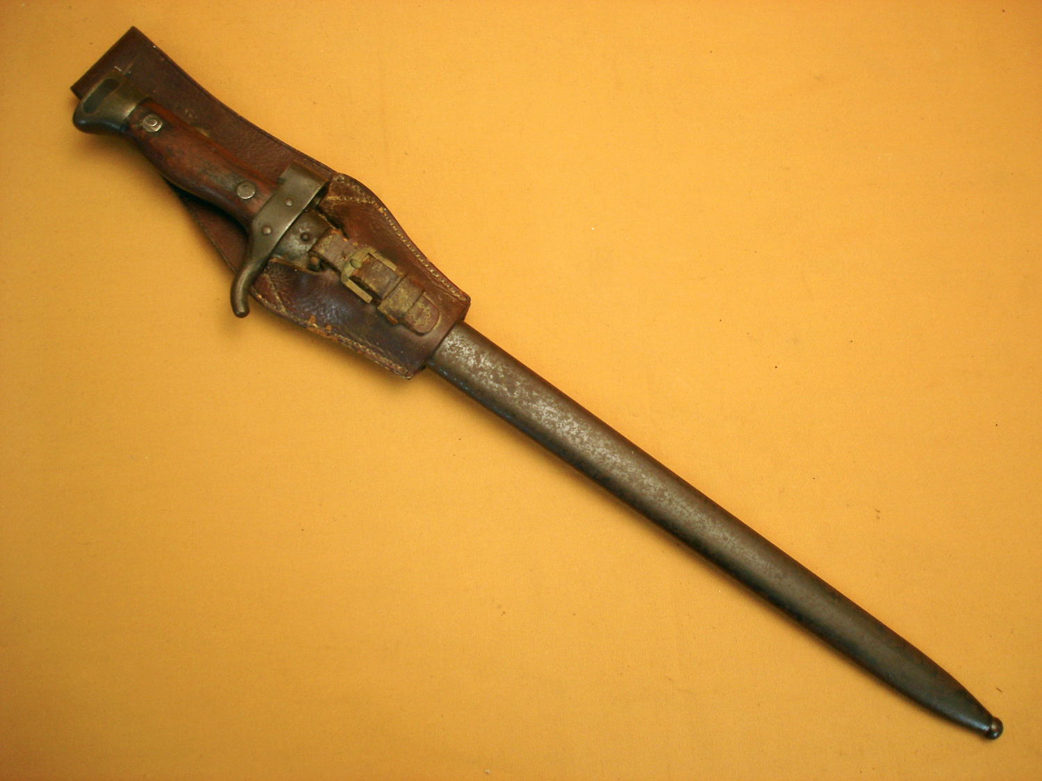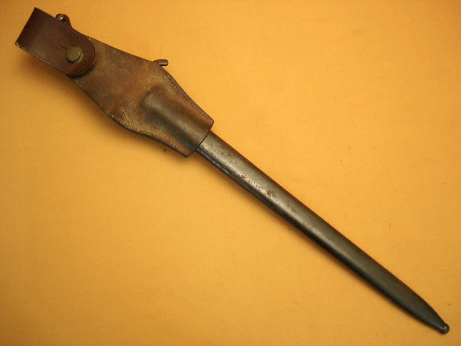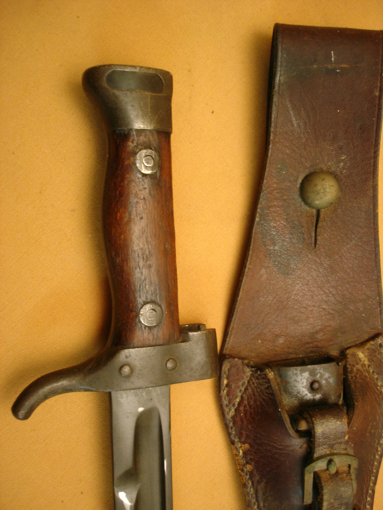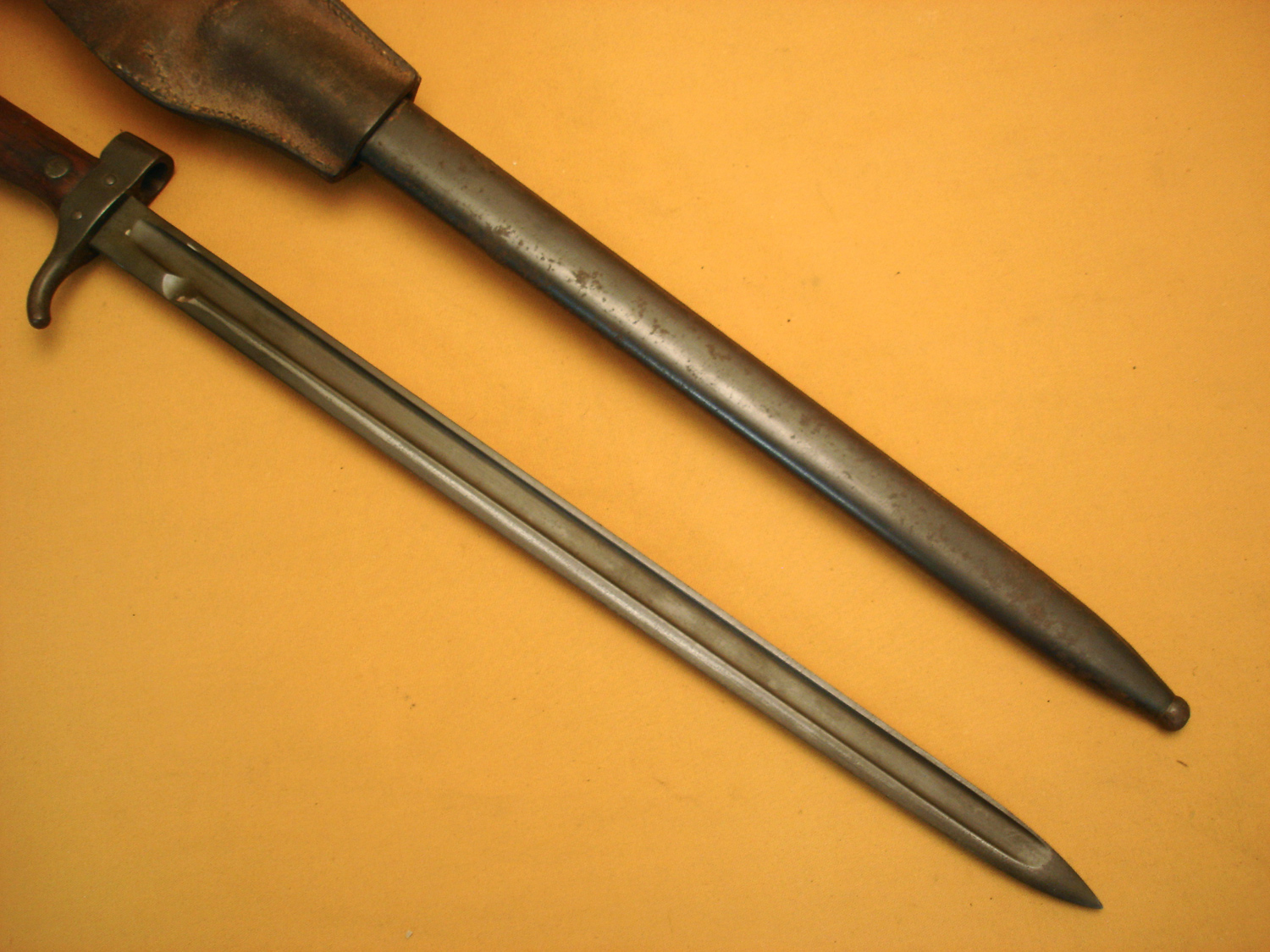 Baïonnette de Mousqueton 92, modèle sans quillon, belle lame bronzée, plaquettes bois, avec son porte baïonnette en cuir fauve, dans son" jus".