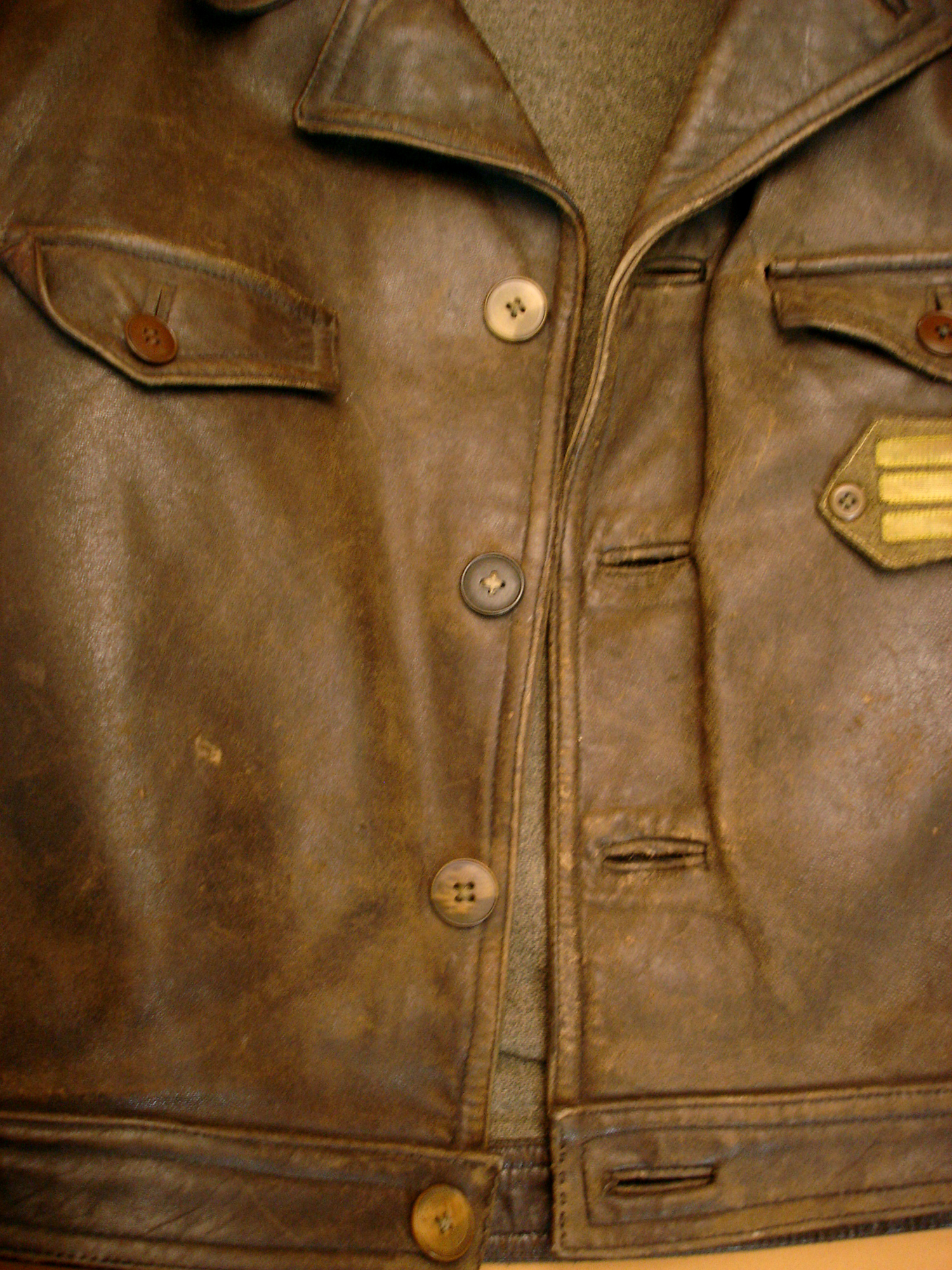 Blouson Chantier de Jeunesse, en cuir marron, doublure réglementaire, tampon de réception de 1941, dans la poche intérieure insigne tissus CJF. Blouson réutilisé par le maquis, grade amovible de capitaine sur la poitrine. Cuir souple, usure d'usage.