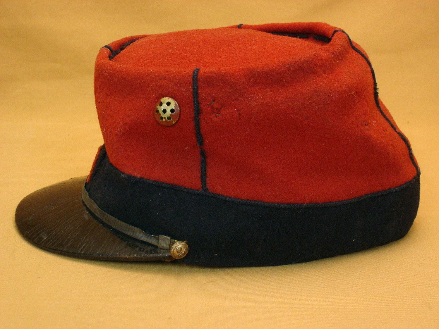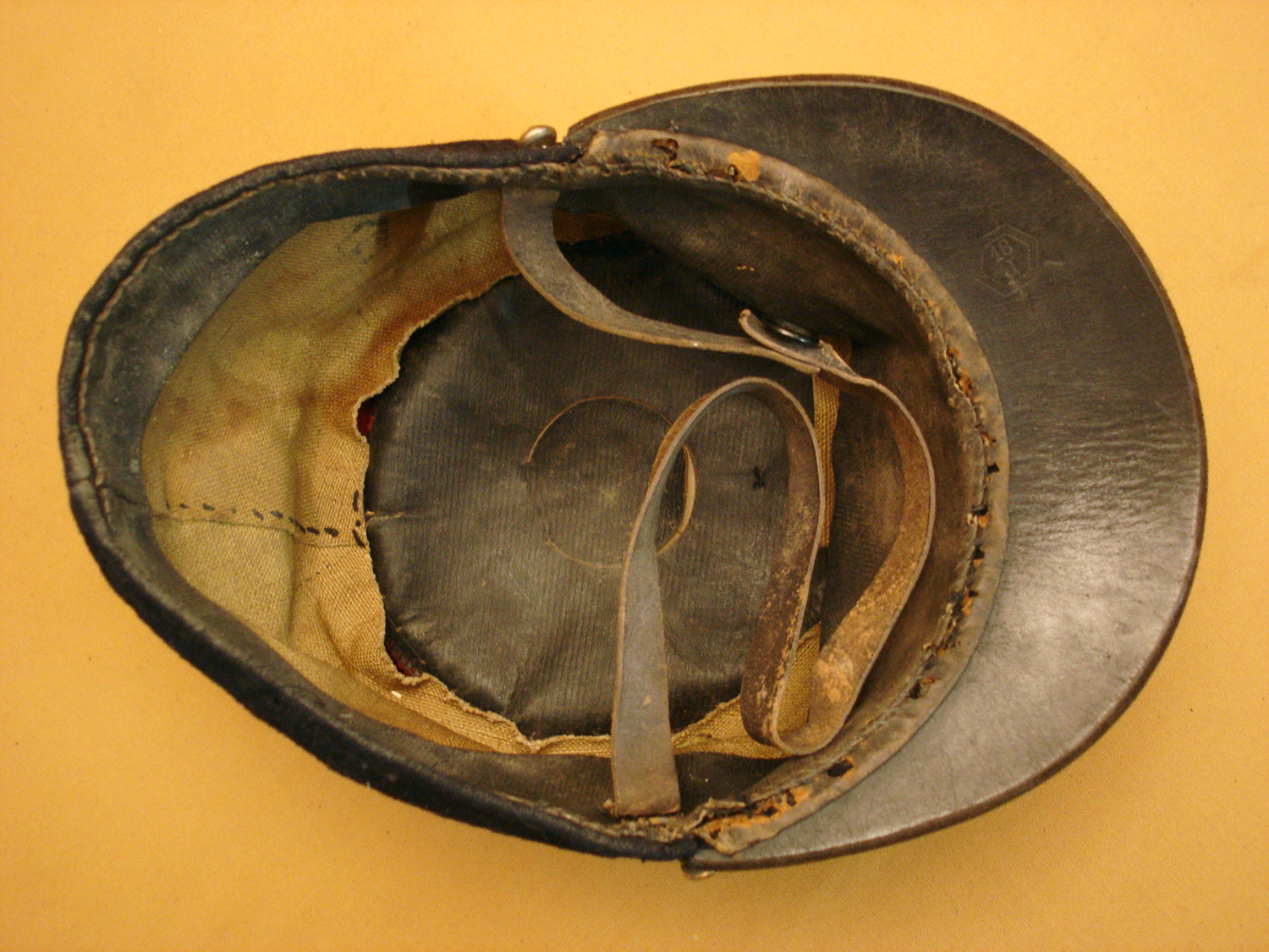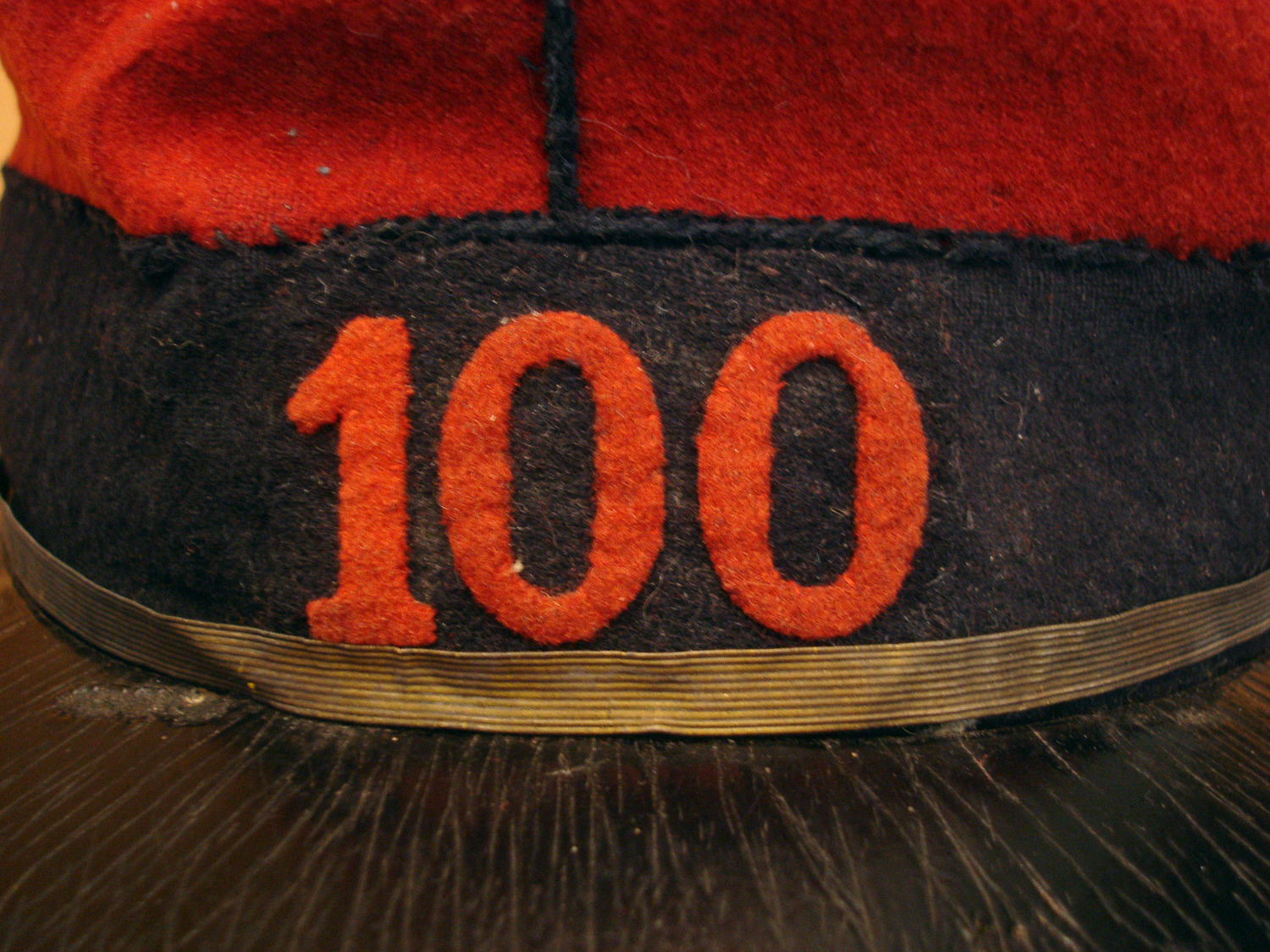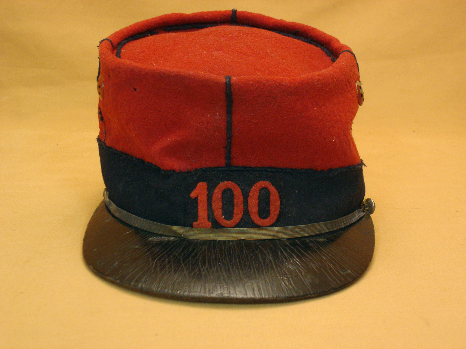 Képi 1884 troupe du 100e RI (Tulle), jugulaire de sous officier, beaux marquages, avec sa rare jugulaire cuir de coiffe souvent manquante, usure d'usage.
