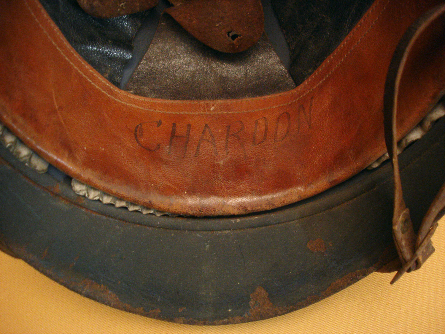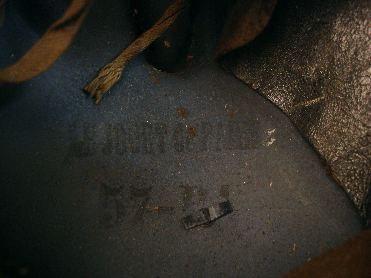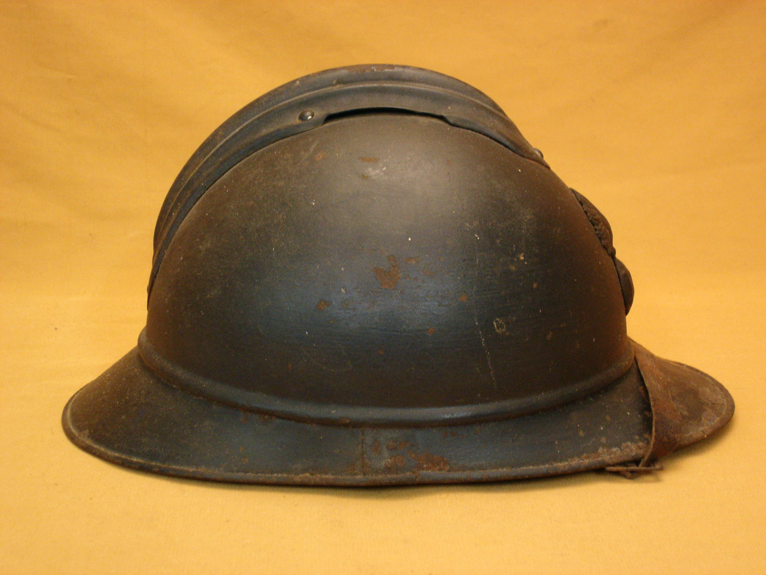 Casque Adrian 15, Infanterie, bleu horizon, fabricant peu courant "Le Jouet de paris", complet avec sa coiffe cuir du 2e type et sa jugulaire, nom du soldat sur le cuir, jamais nettoyé.