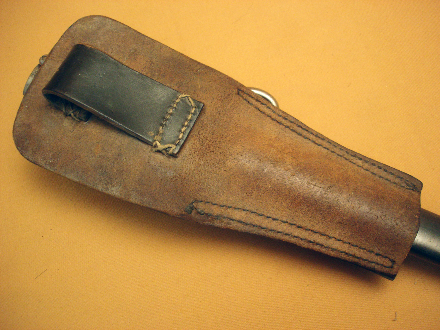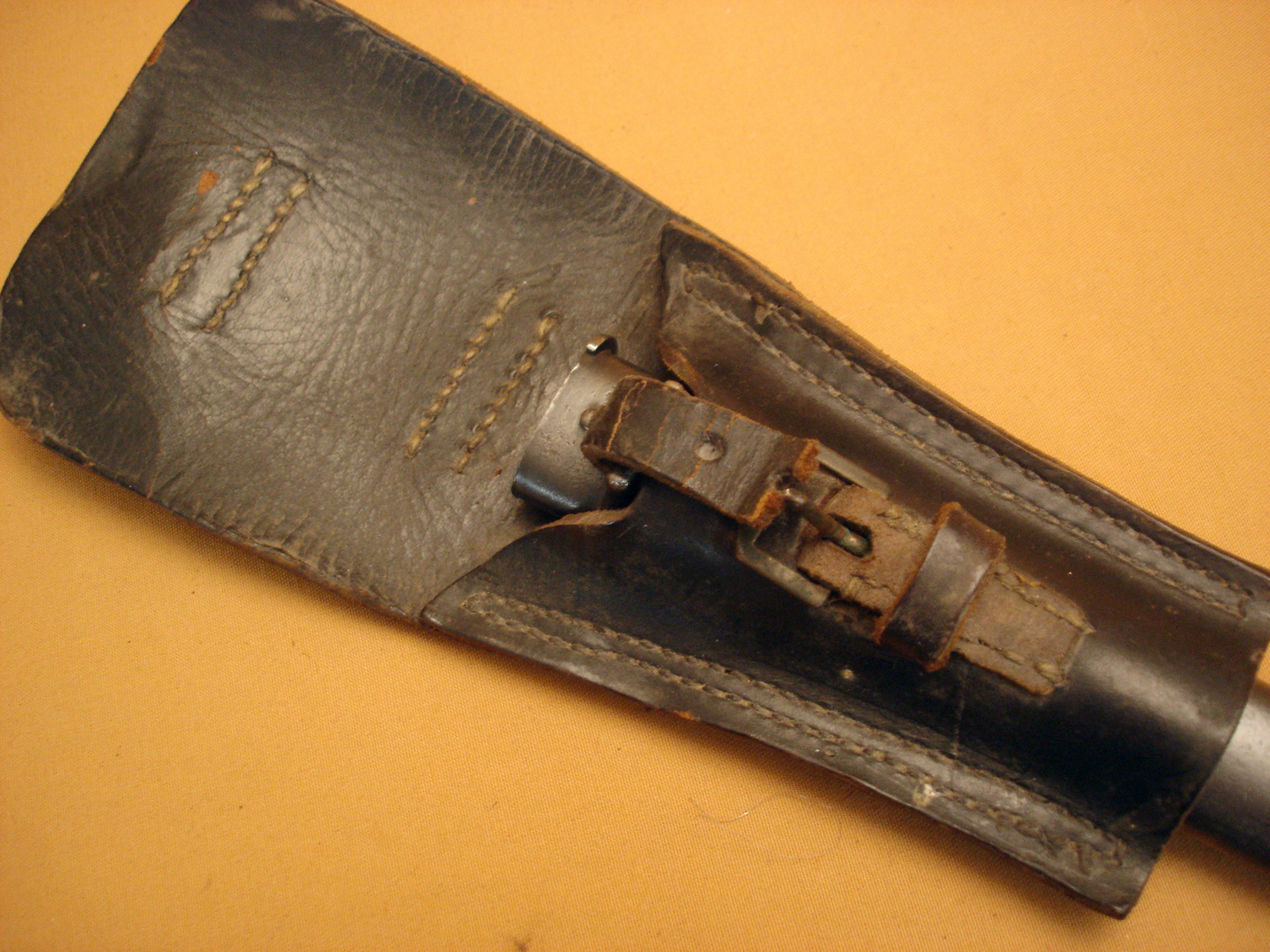 Baïonnette Berthier 1892, 1er type avec gravure d'arsenal, très belle lame gravée "Manufacture d'Armes de Châtellerault 7 bre 1893", poinçons au niveau du talon, plaquettes en ébonite, avec son fourreau bronzé (numéro différent) et son porte baïonnette en cuir noir.